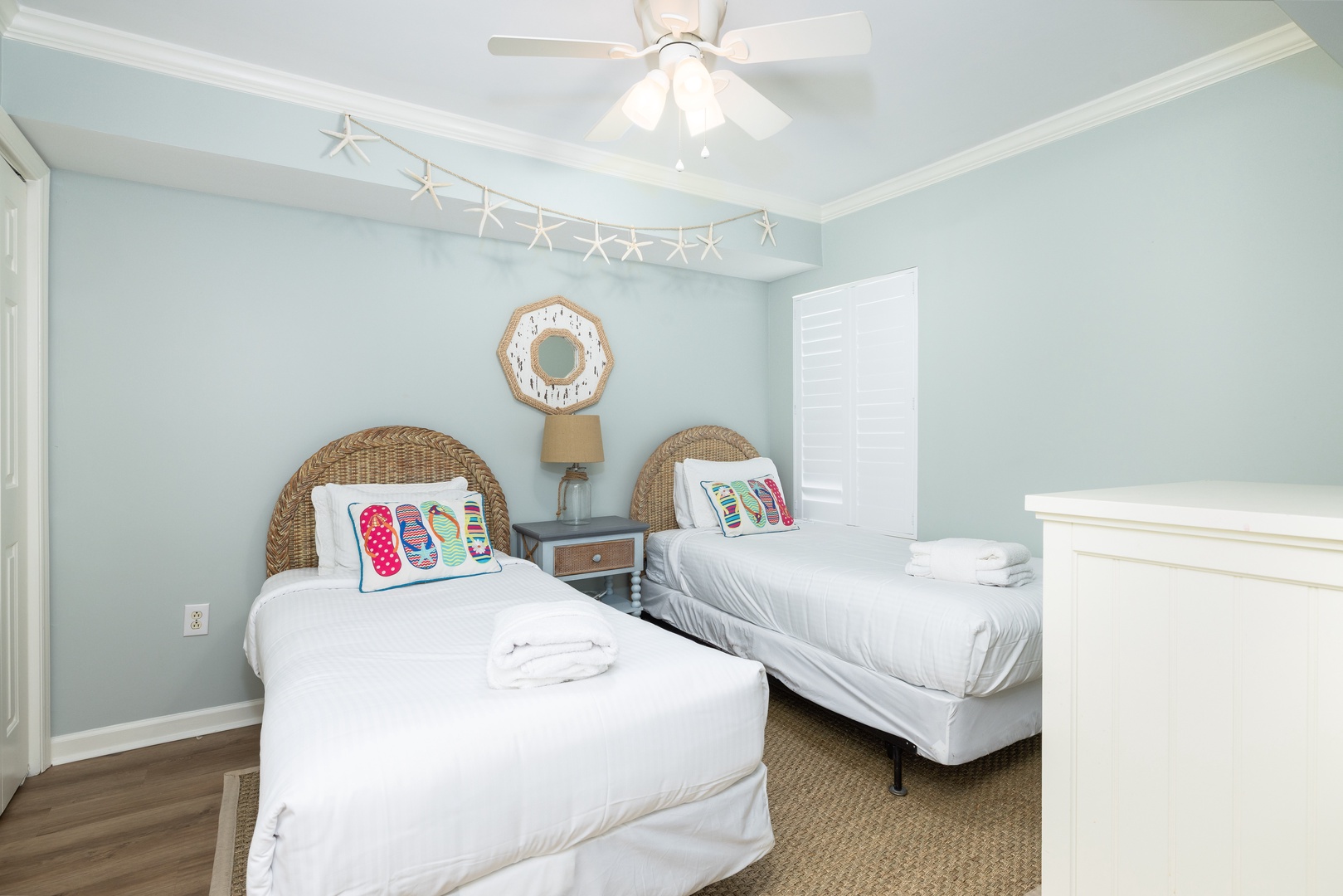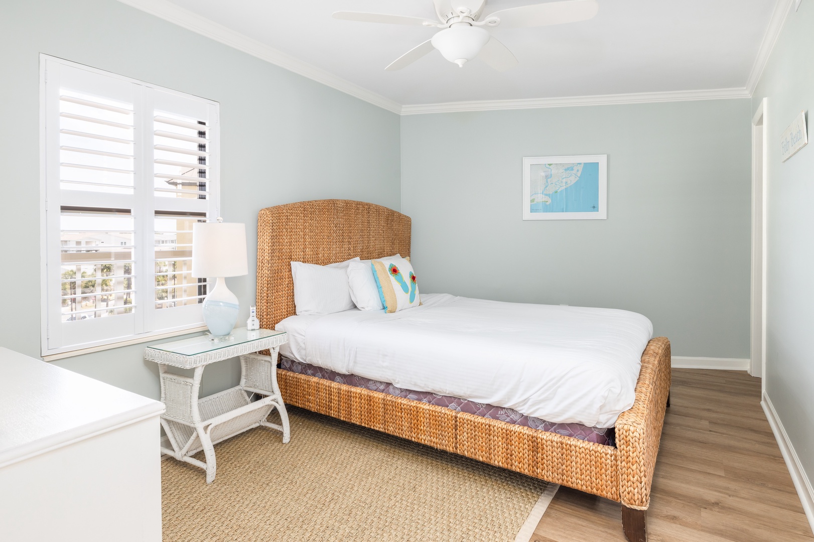 The spacious living room features floor-to-ceiling windows, offering breathtaking ocean views and plenty of natural light. Relax with your group on the comfortable seating or gather around the large dining table for family meals or card games. The expansive balcony is the perfect spot to watch the sunset over the west end of Folly Beach.