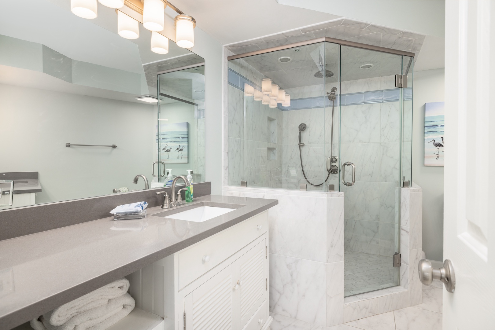 Primary Bedroom: This extra-large room boasts ocean views, direct balcony access, and an en-suite bathroom with a huge walk-in shower and double sinks.