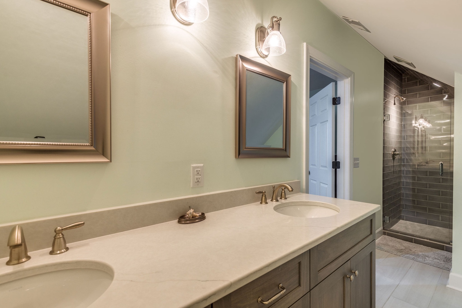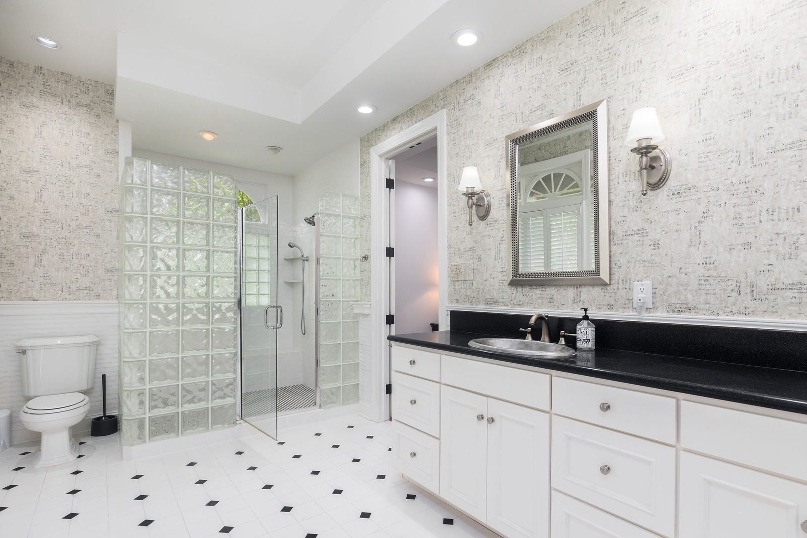 Coastal updated bathroom featuring double vanity, walk-in glass shower
