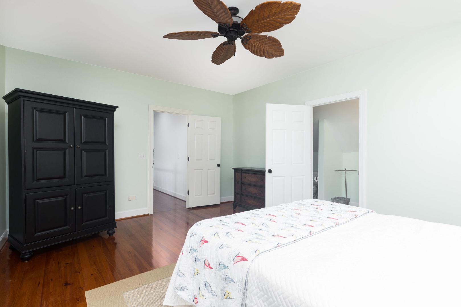 Inviting coastal bedroom with a queen bed and smart TV and dresser storage and an en-suite bathroom