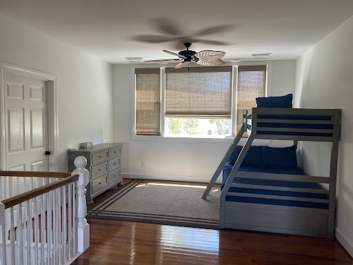 Light-filled loft area with twin-over-full bunk beds, a Smart TV, and dresser storage