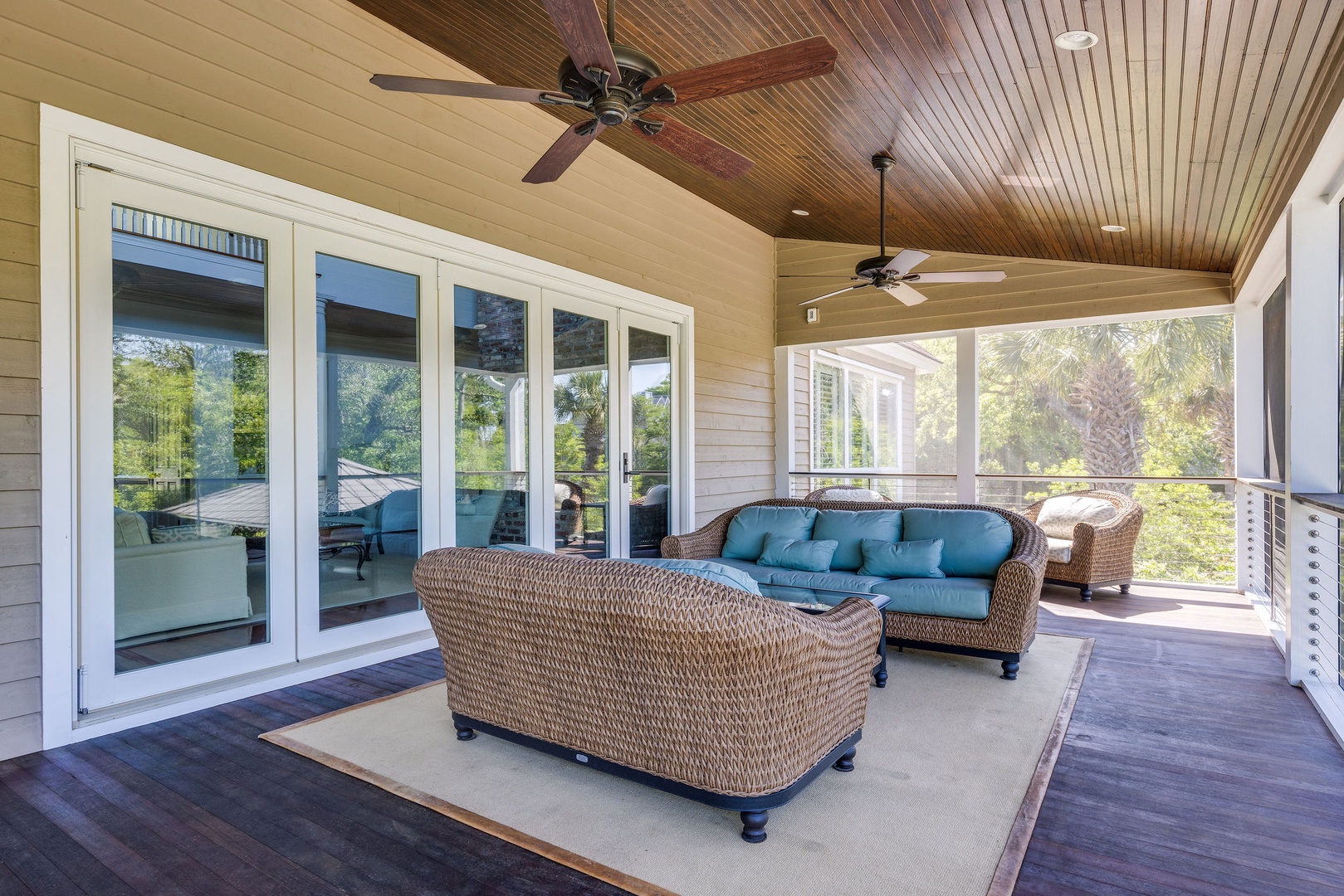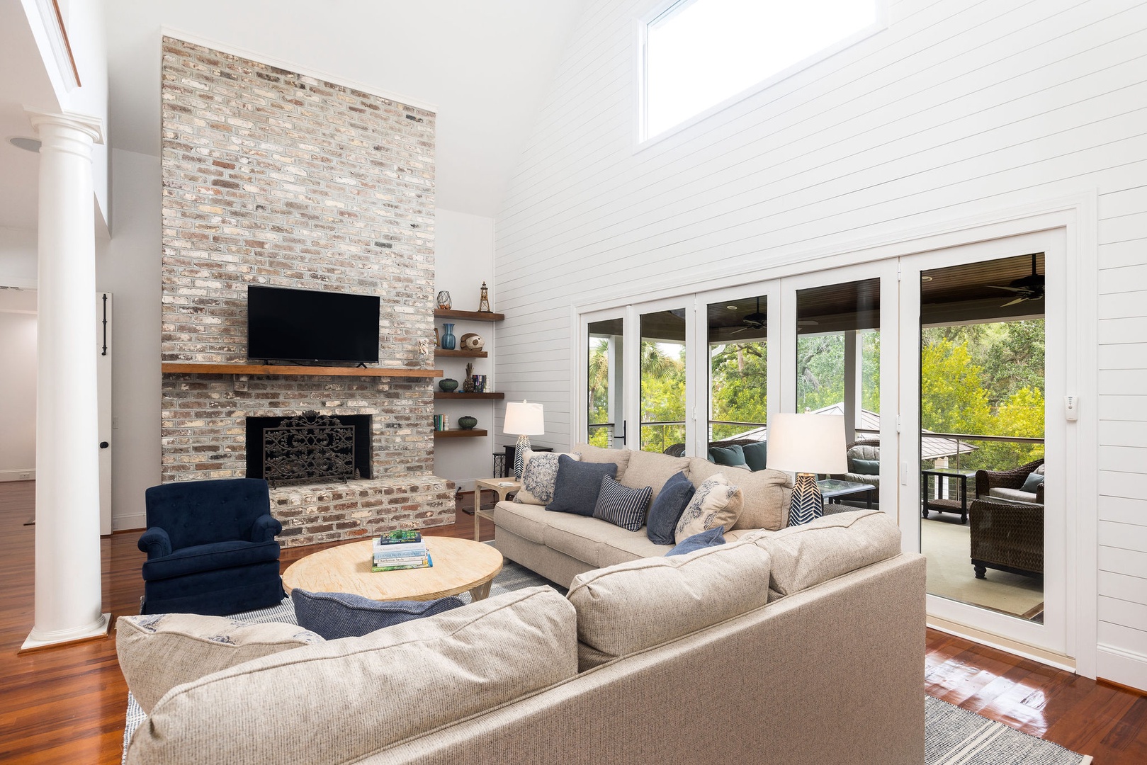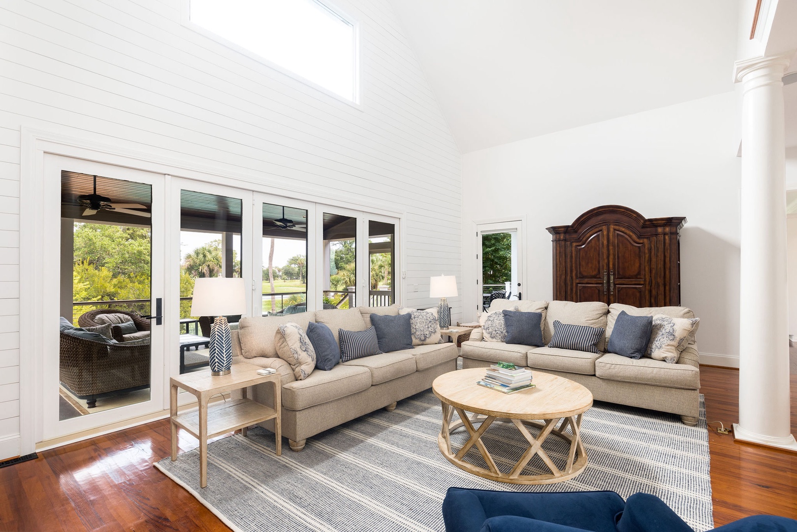 Spacious living room with two cozy couches, a flat-screen TV, and panoramic doors that open up to the large screened porch overlooking the golf course. Enjoy a movie night with the family or mix up your favorite cocktail at the nearby dry bar.
