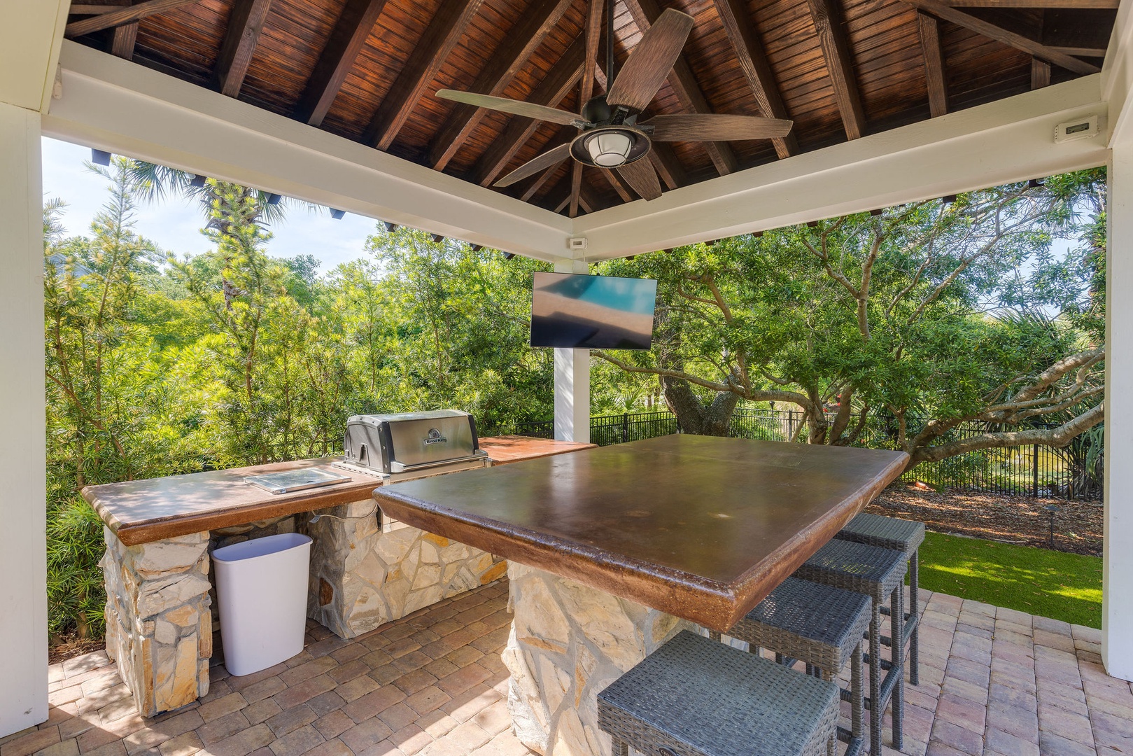Large screened-in porch perfect for watching movies under the stars or observing golfers on the course. Descend the porch steps to the private swimming pool with lounging seats and an outdoor kitchen area, including a gas grill, island, and an outdoor television.