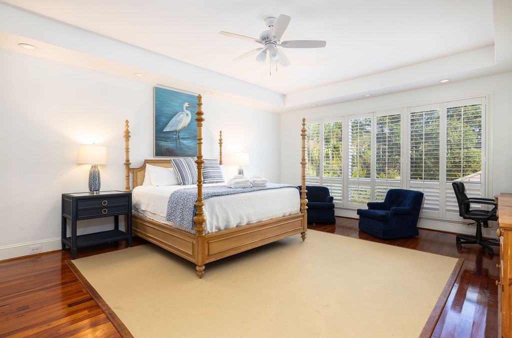 Coastal beach-inspired primary bedroom with a king bed plus smart TV, ensuite bath and a peaceful setting