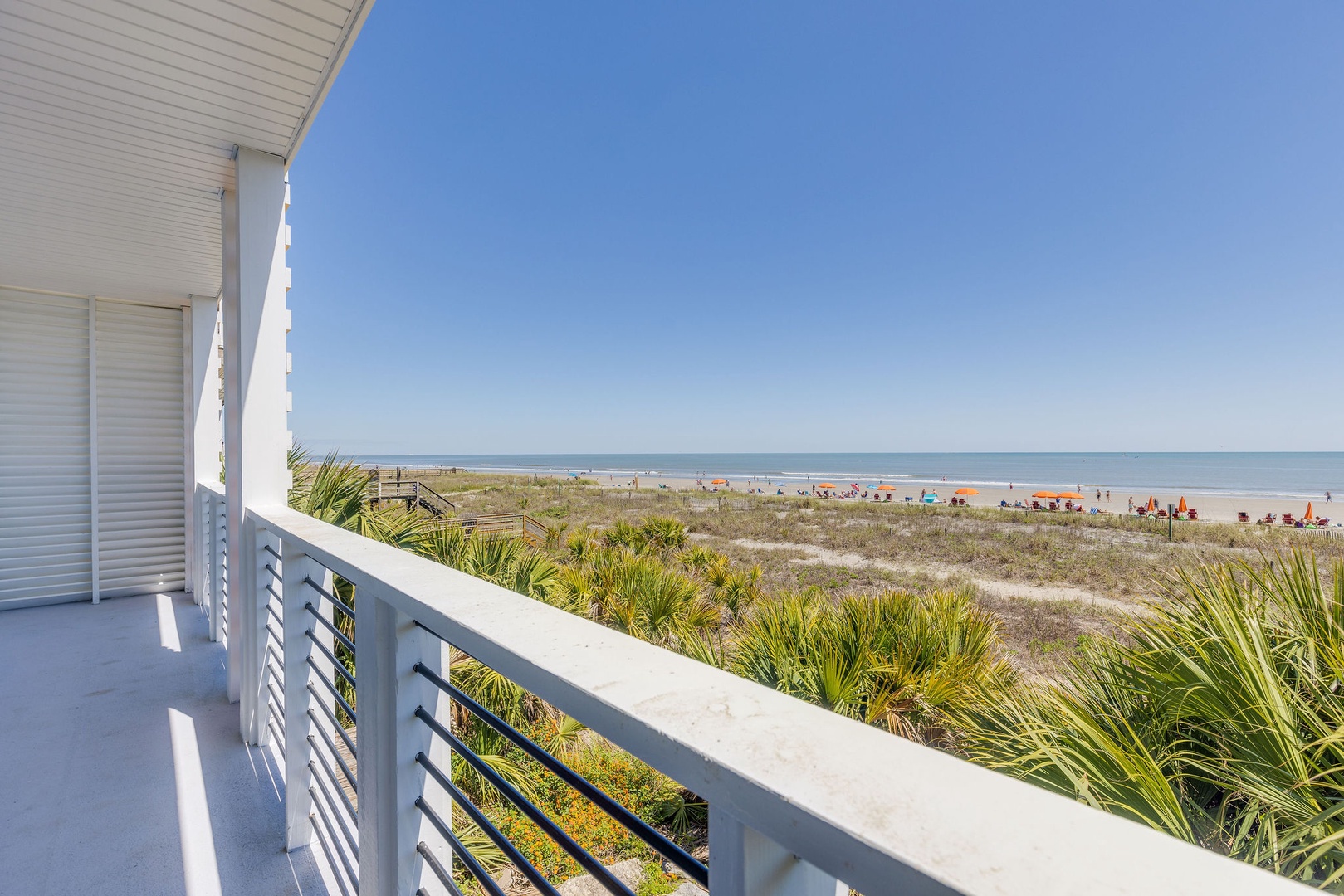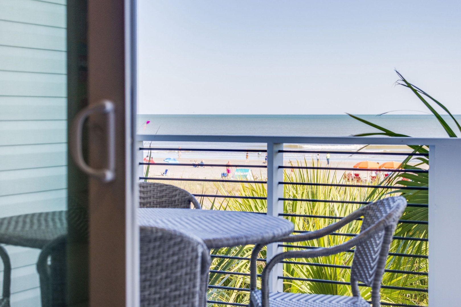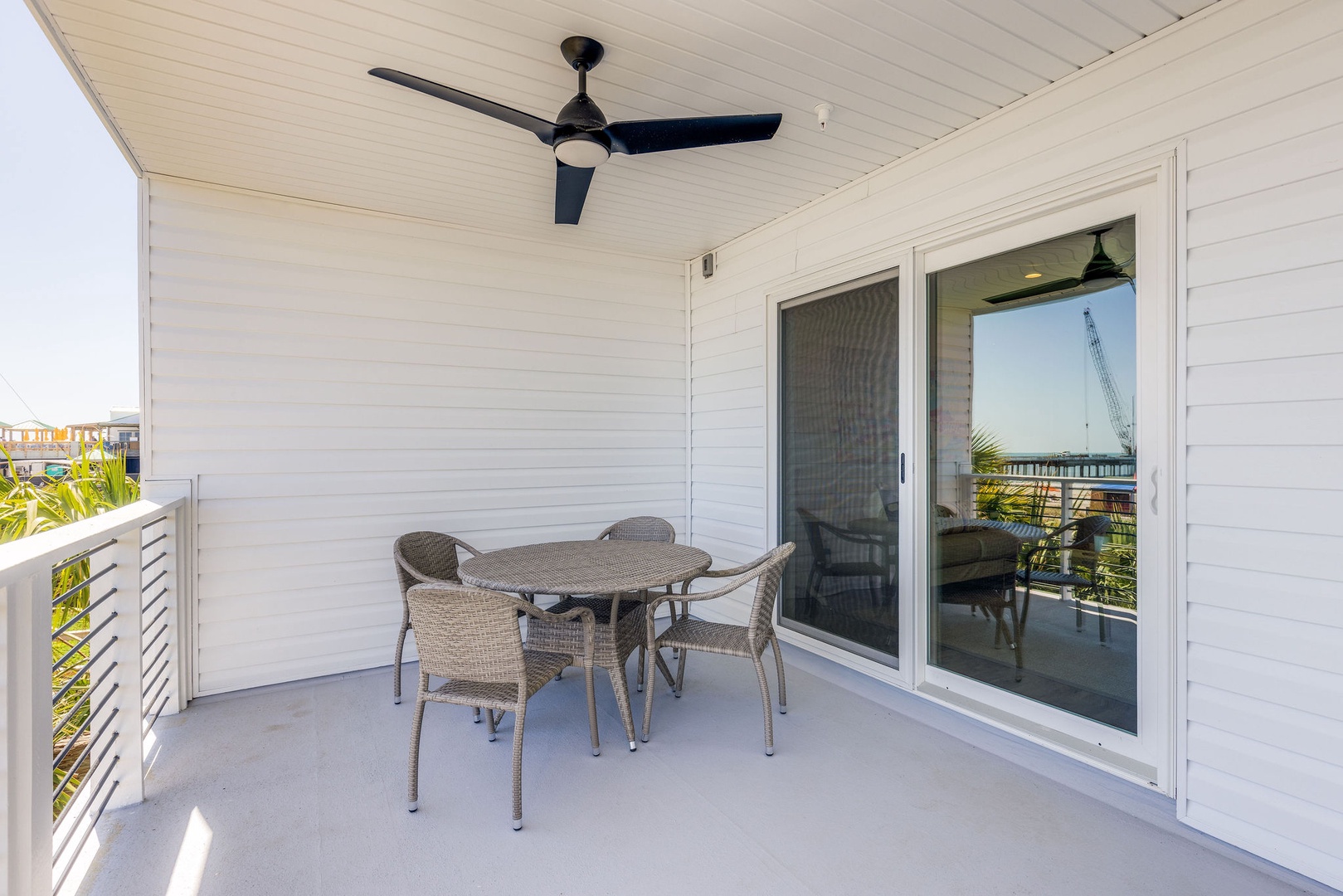The private deck offers spectacular ocean views, ideal for enjoying the sea breeze and unwinding after a day on the beach. This space provides a tranquil spot to savor the beauty of Folly Beach.