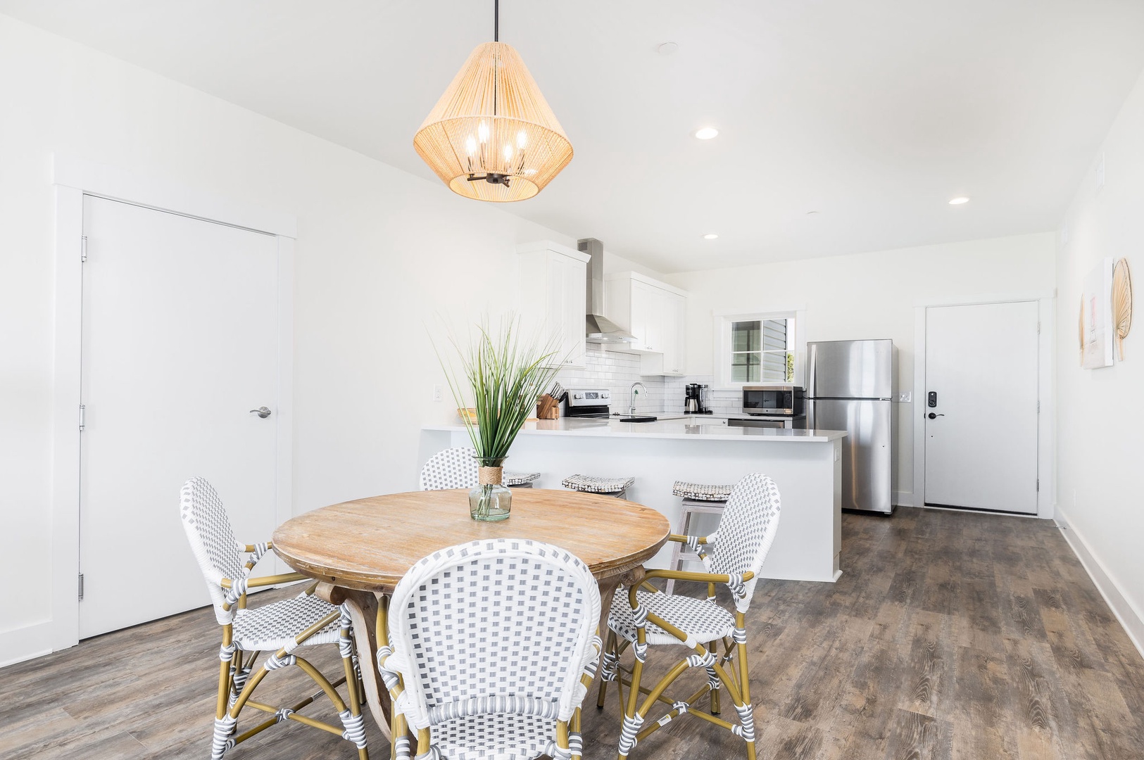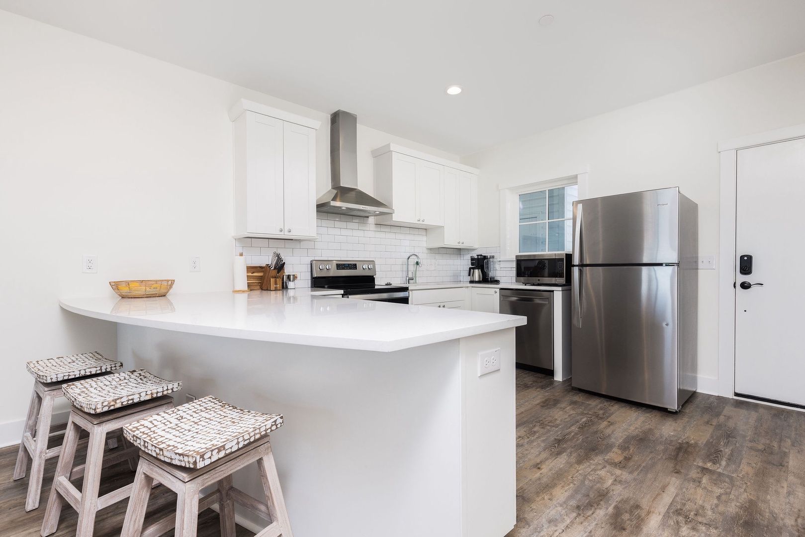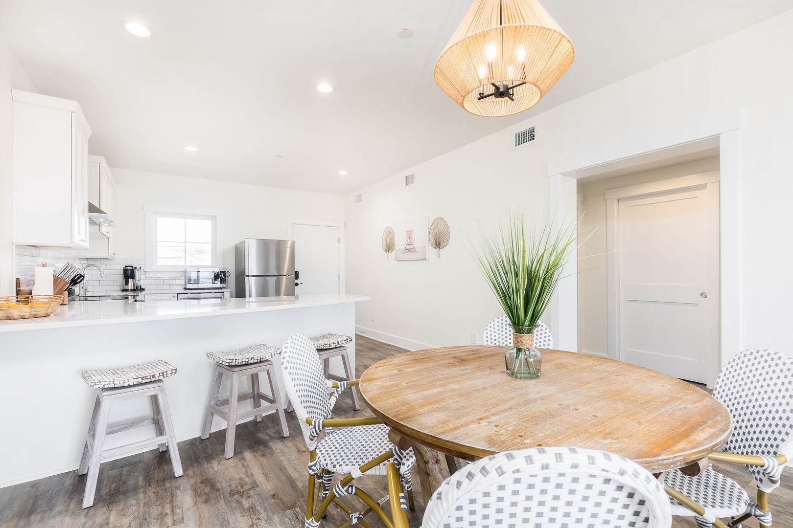 The fully equipped kitchen features modern appliances, ample counter space, and an inviting layout that opens to the dining and living areas, making meal preparation a breeze.