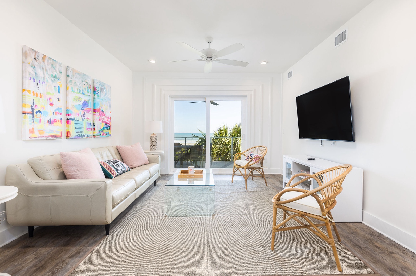Mermaid Cove offers a private deck with spectacular ocean views, allowing guests to unwind in the fresh sea breeze. This space is ideal for morning coffee or evening relaxation as you take in the serene beach atmosphere.