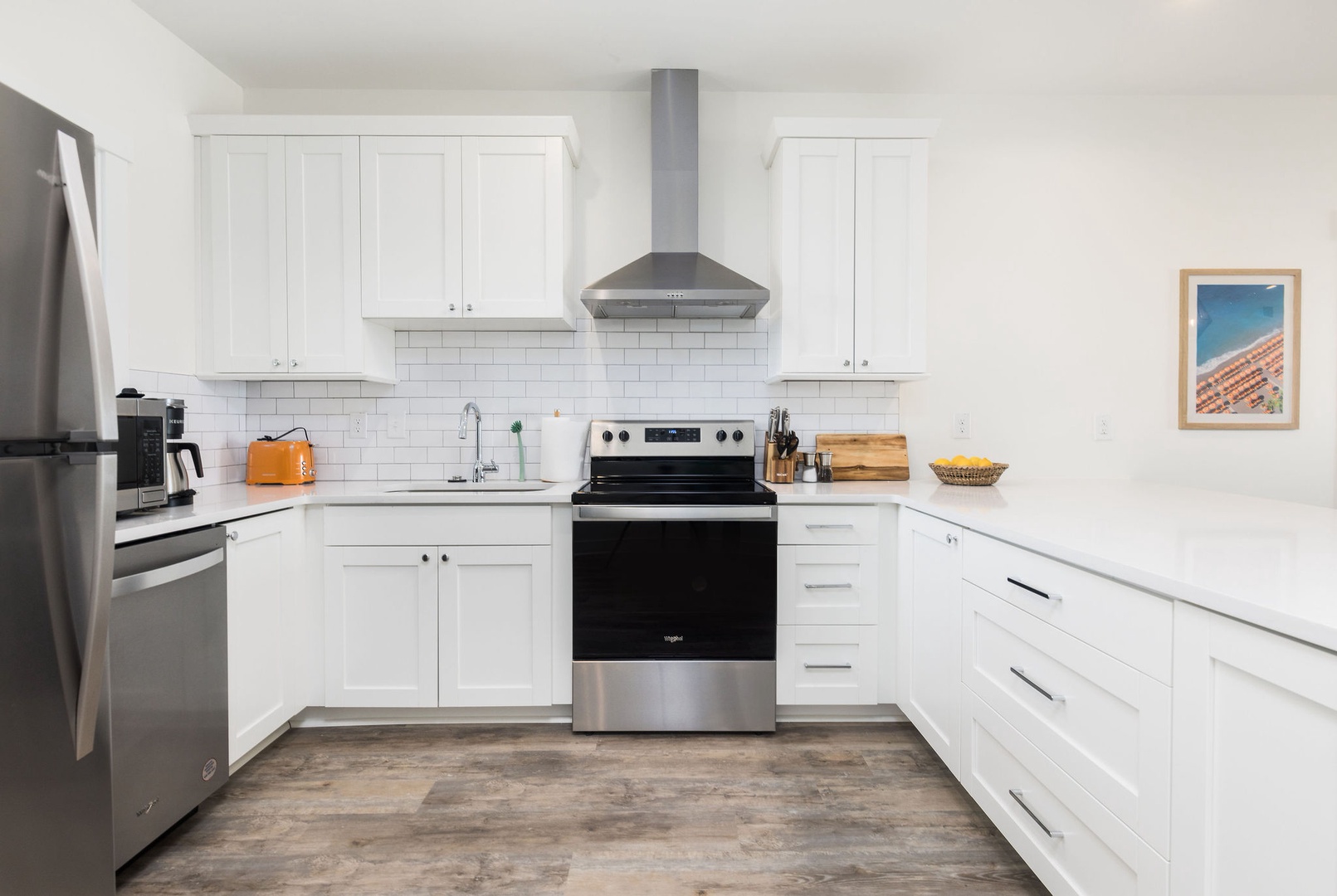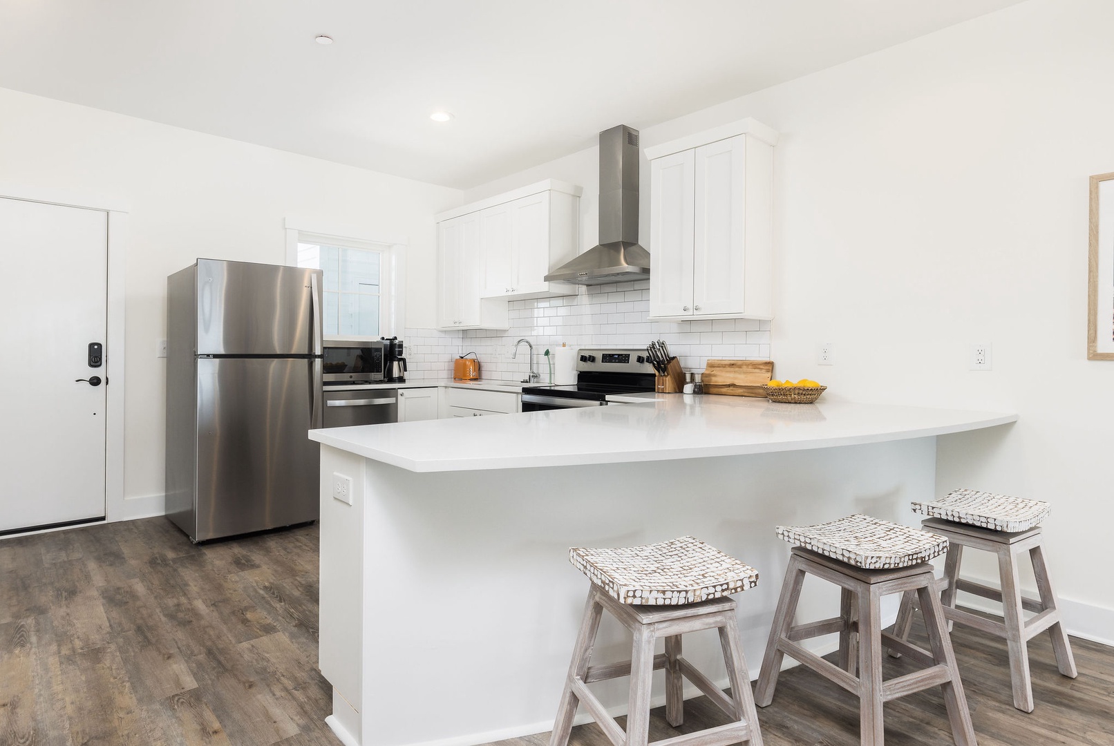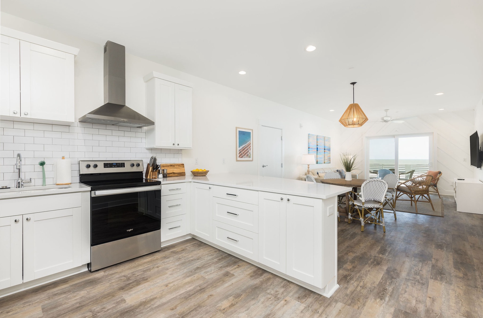 The fully equipped kitchen includes modern appliances, ample counter space, and an open design, allowing you to prepare meals while enjoying ocean views.