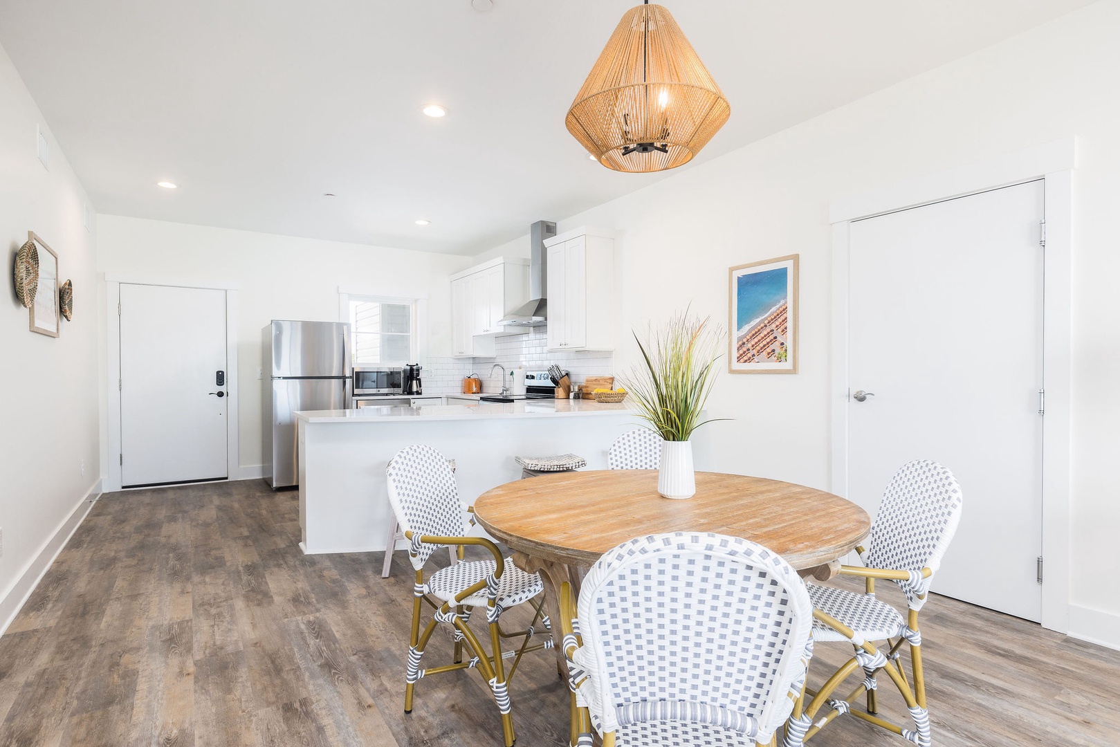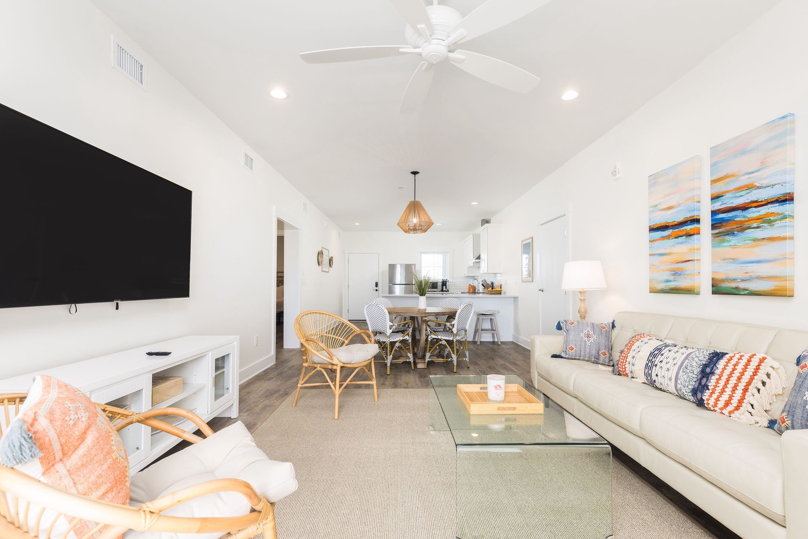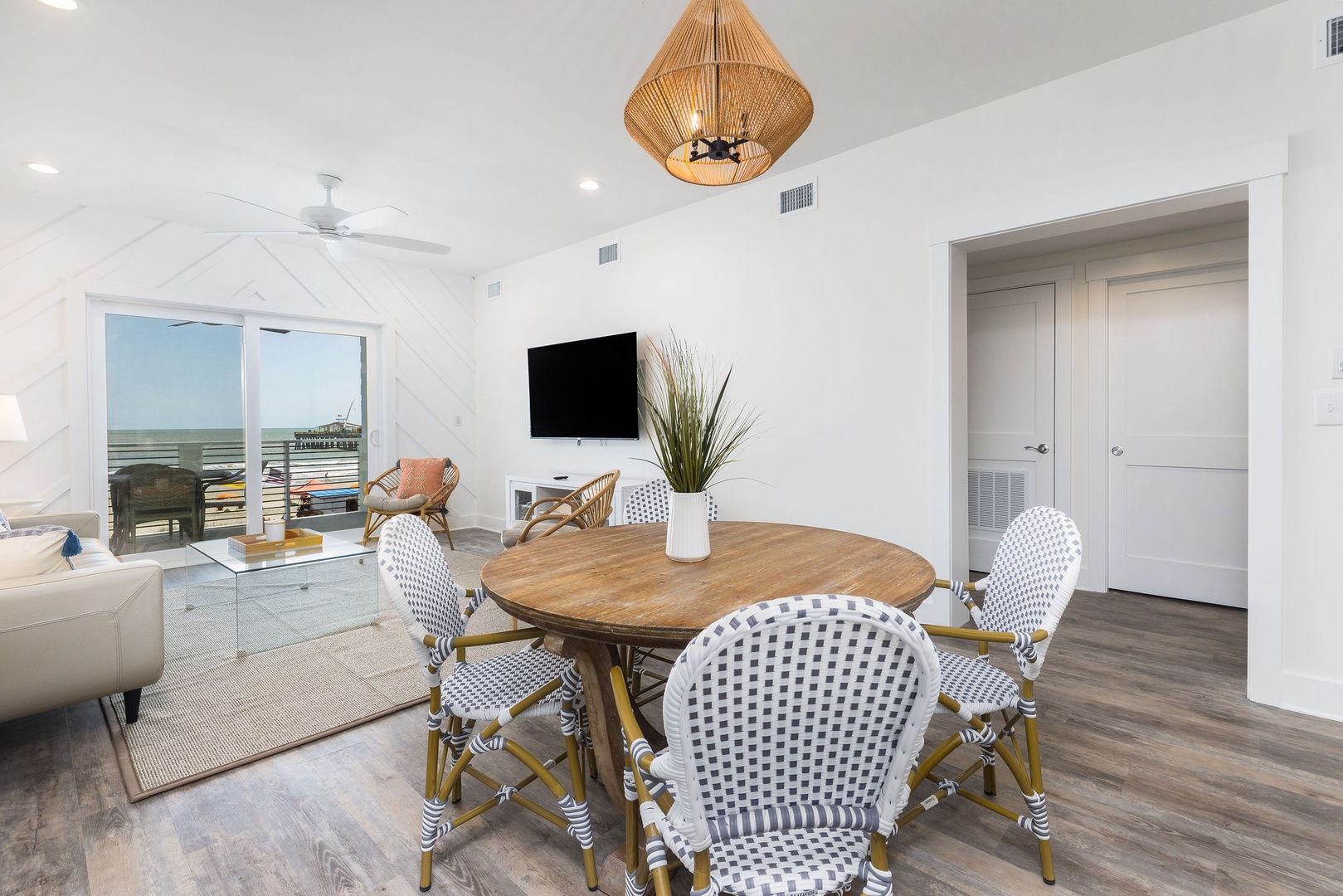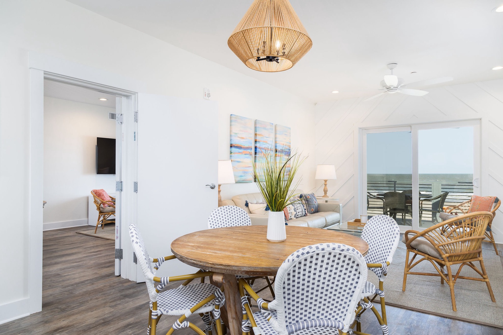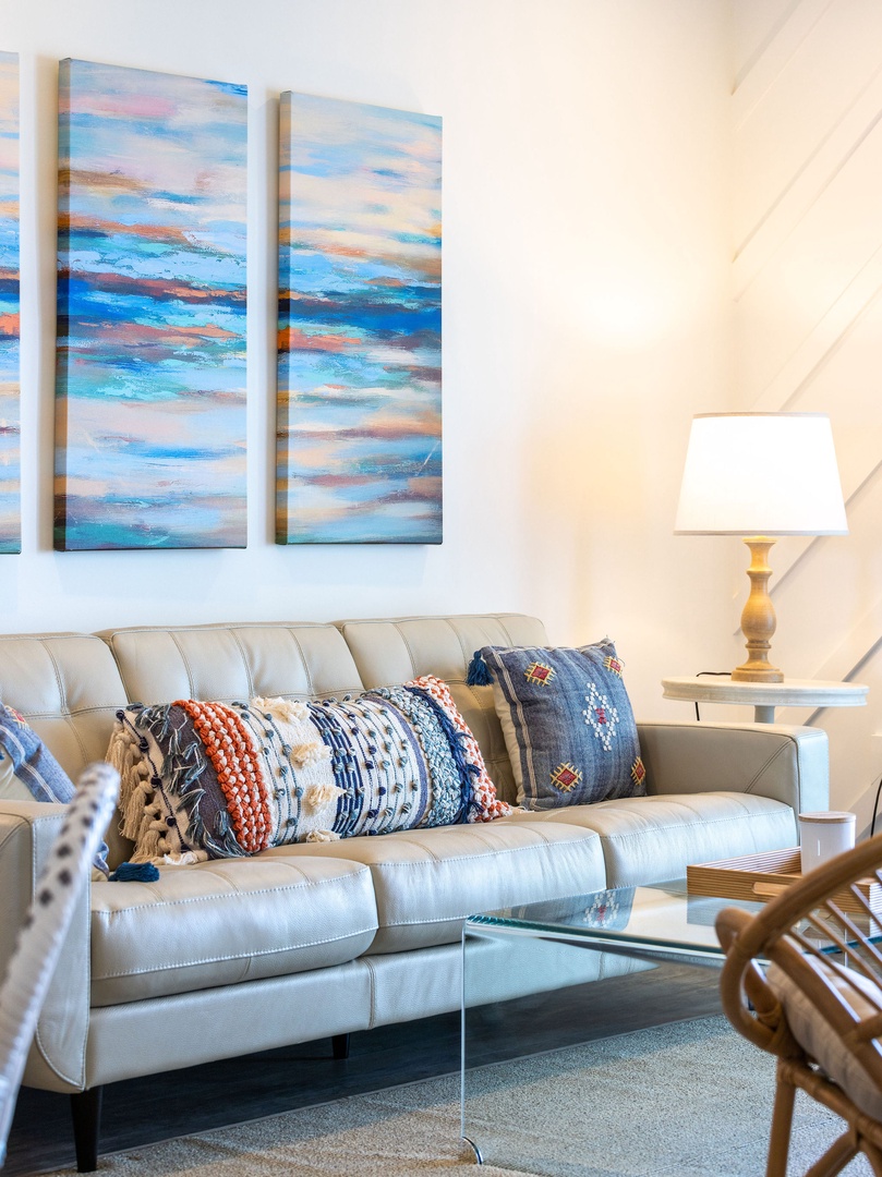 The spacious living area is tastefully decorated with coastal-inspired furnishings and large windows to capture breathtaking ocean views. The open layout connects effortlessly to the dining and kitchen areas, creating a welcoming space for relaxation and entertaining.