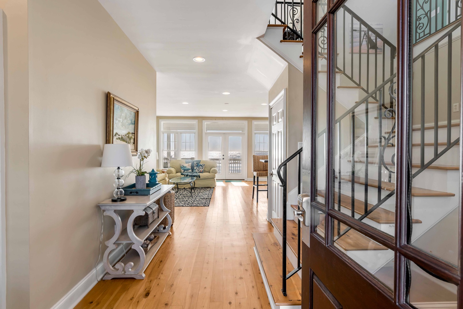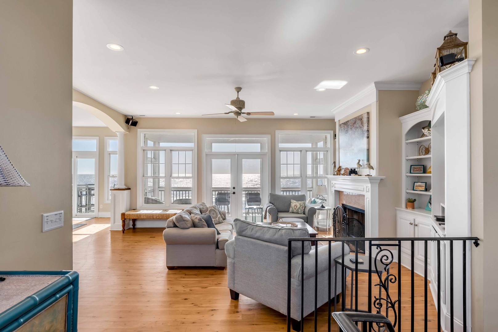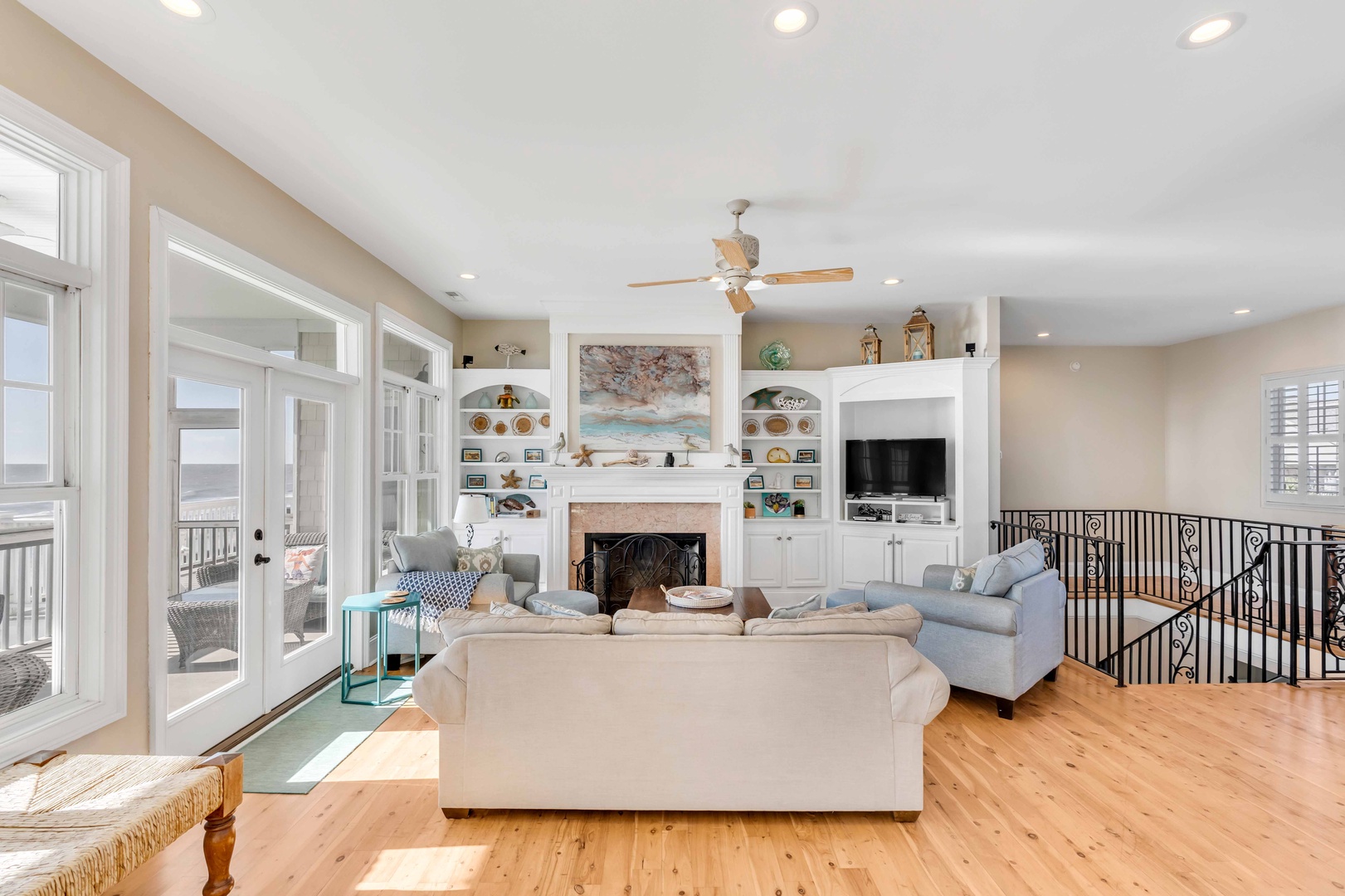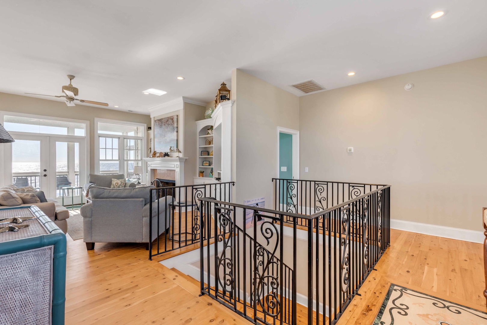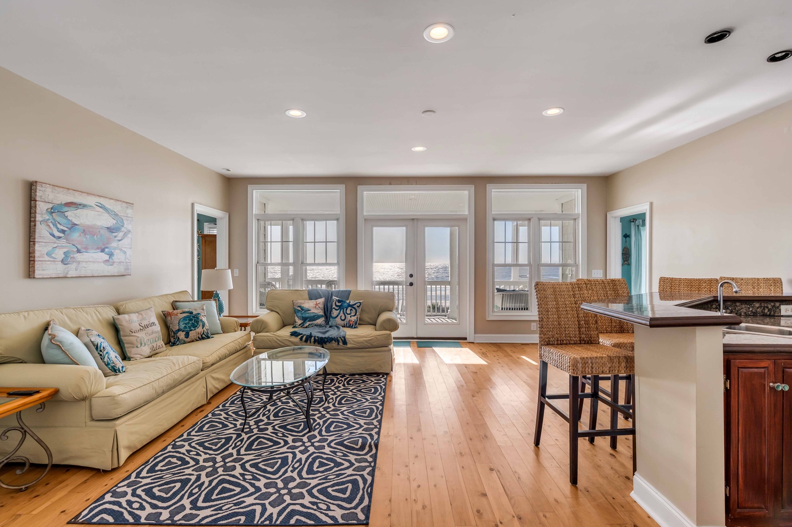 The first floor features a cozy living area with ocean views, perfect for unwinding after a day at the beach. The second floor is an open-concept living space filled with natural light, ideal for family gatherings and enjoying the view.