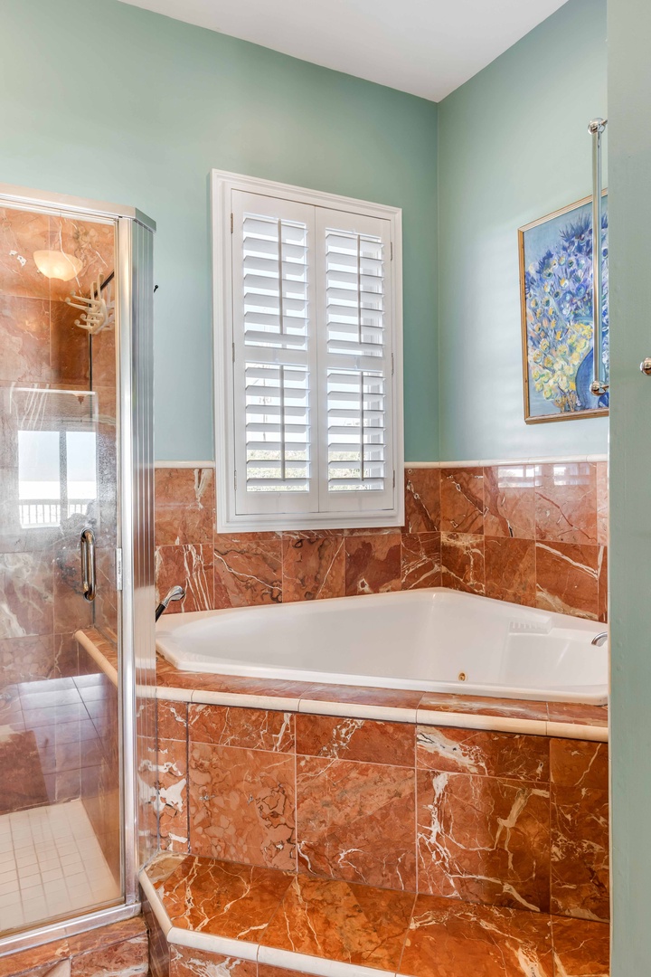 Modern, Jack and Jill bathrooms on the first floor and a en-suite bathroom in the master bedroom featuring a whirlpool tub. Fresh towels and complimentary toiletries are provided.