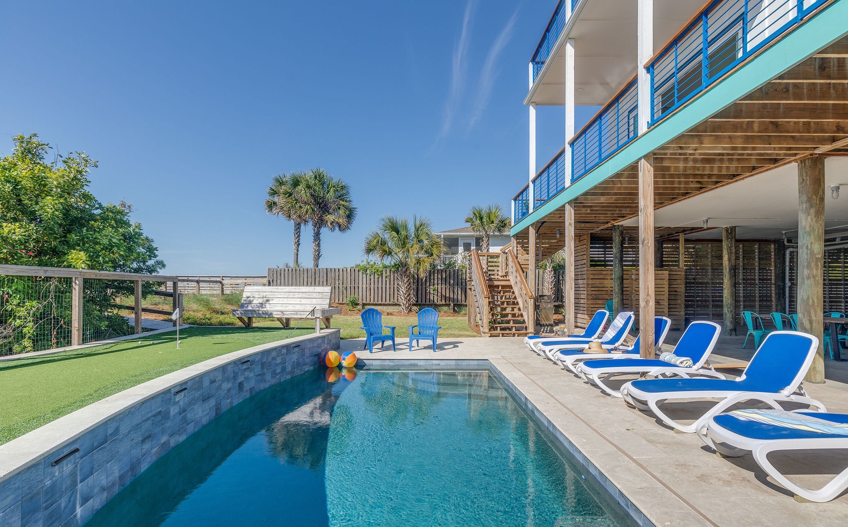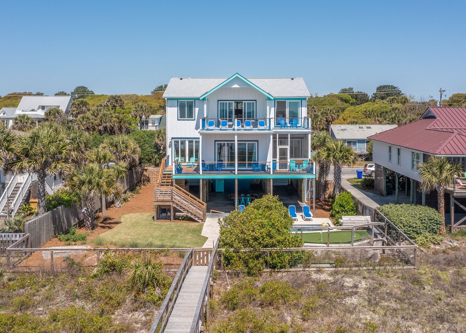 Welcome to SurSea, a spacious oceanfront retreat designed for families and groups seeking relaxation and luxury in Folly Beach. This beautiful 6-bedroom, 6-bathroom home offers ample room to unwind, with stunning ocean views, a private outdoor pool, and a putting green for added fun. Enjoy the soothing sounds of the ocean from any of the three decks, including a poolside lounge, a screened-in middle level, and a top deck perfect for sunset views.