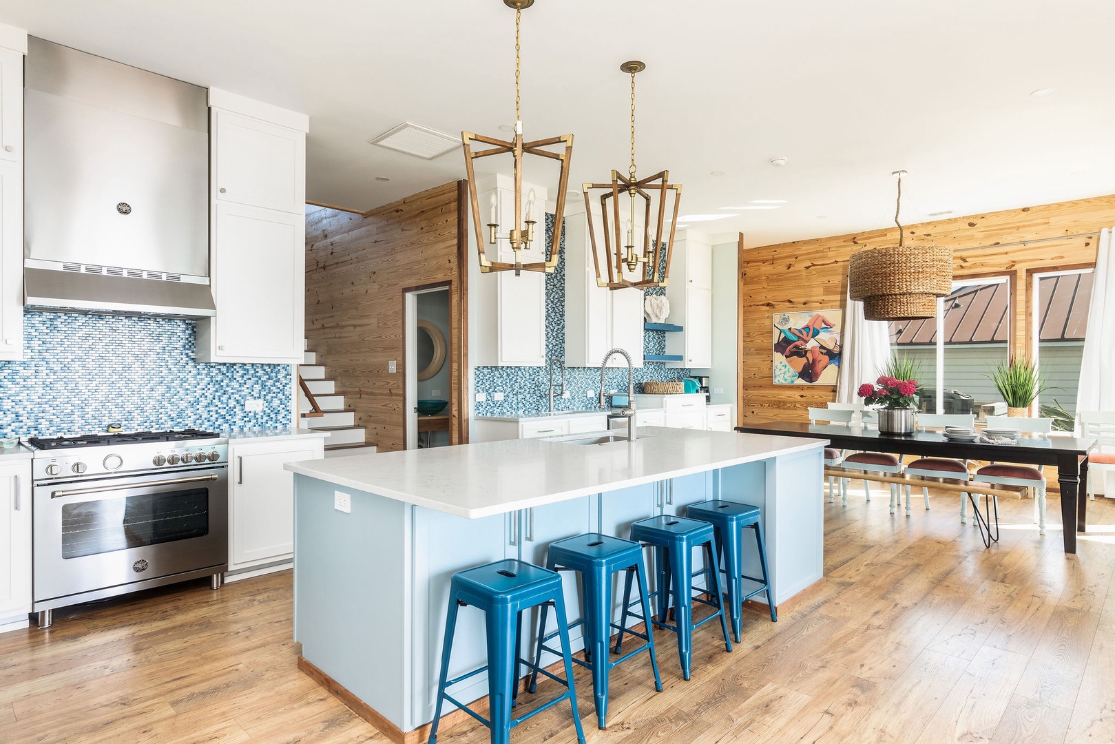 The fully equipped kitchen offers modern appliances, ample counter space, and an open layout that flows into the dining and living areas, making meal preparation and entertaining easy.