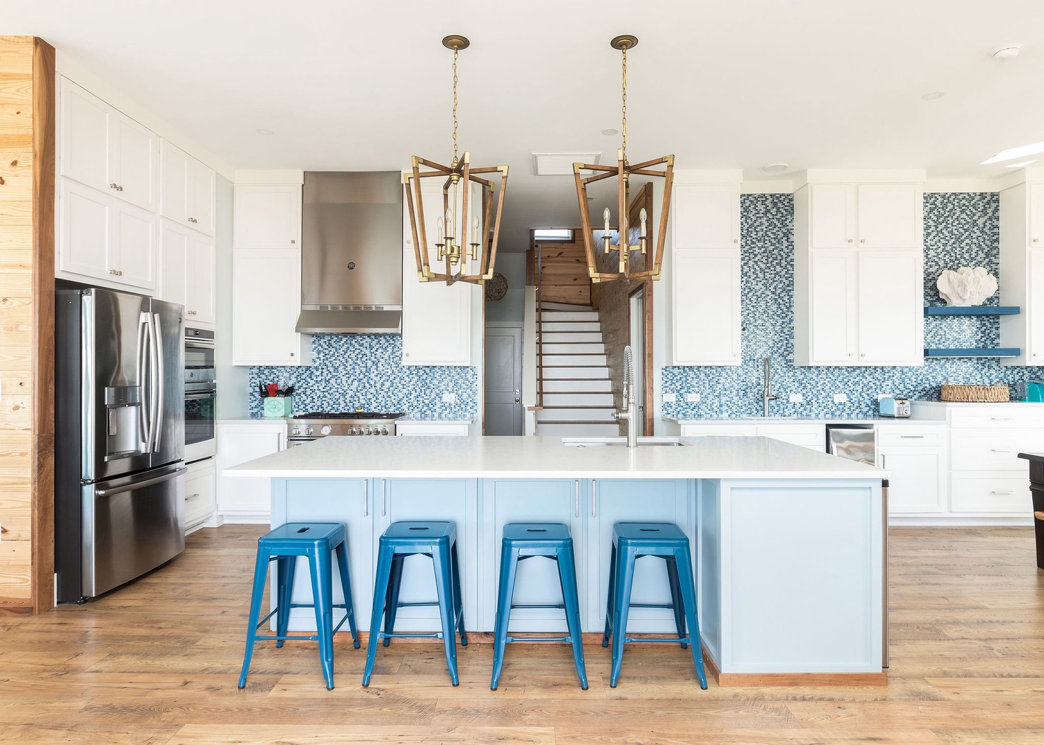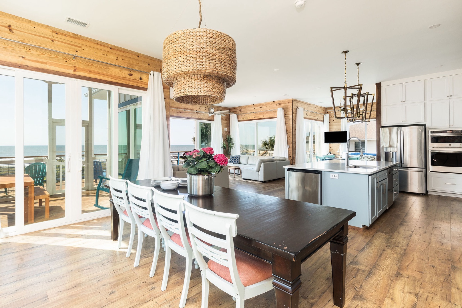 The main floor features an open-plan layout connecting the living area, dining room, and kitchen, creating a welcoming space for gatherings. Upstairs, enjoy a secondary living area with expansive ocean views.