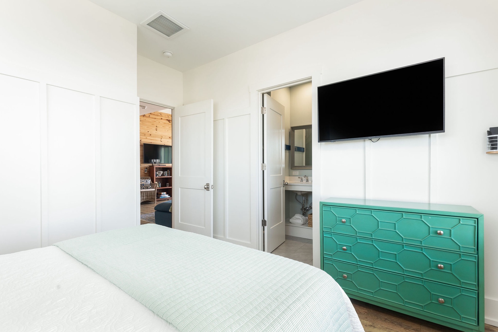 Main Floor Bedroom #2: King bed with a TV and convenient access to the dining area.
