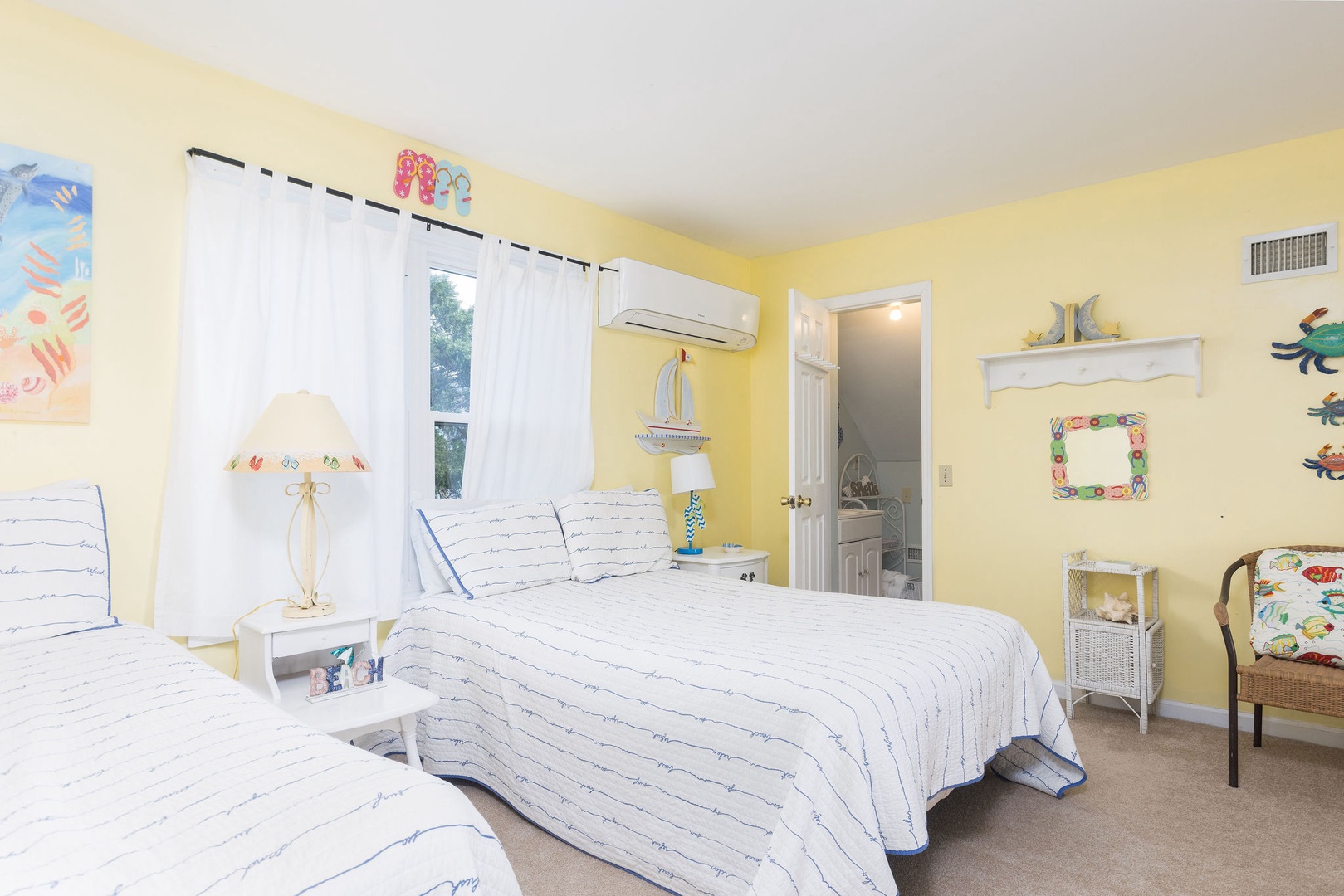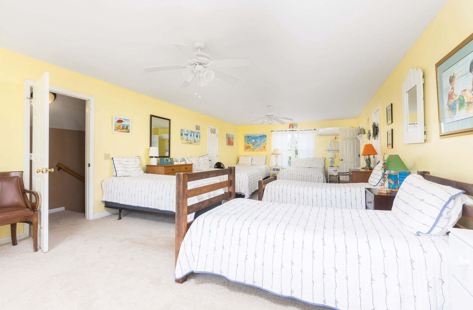 Bedroom 5: Spacious room with three twin beds and three full beds, en-suite bathroom, and a window seat with spectacular ocean views.