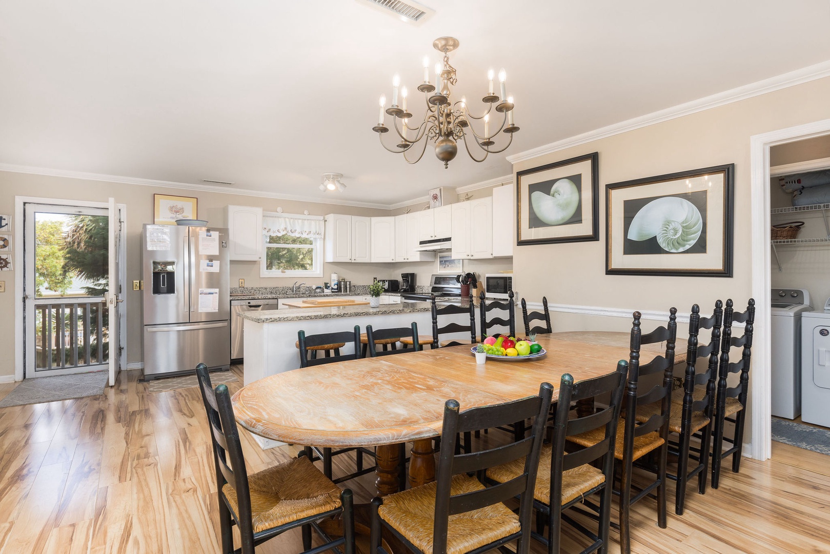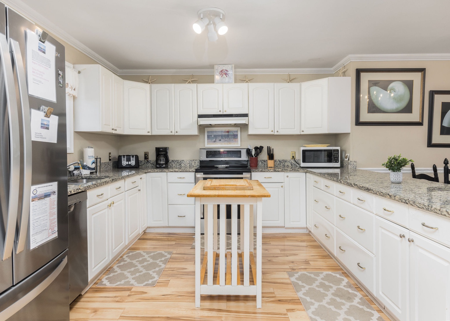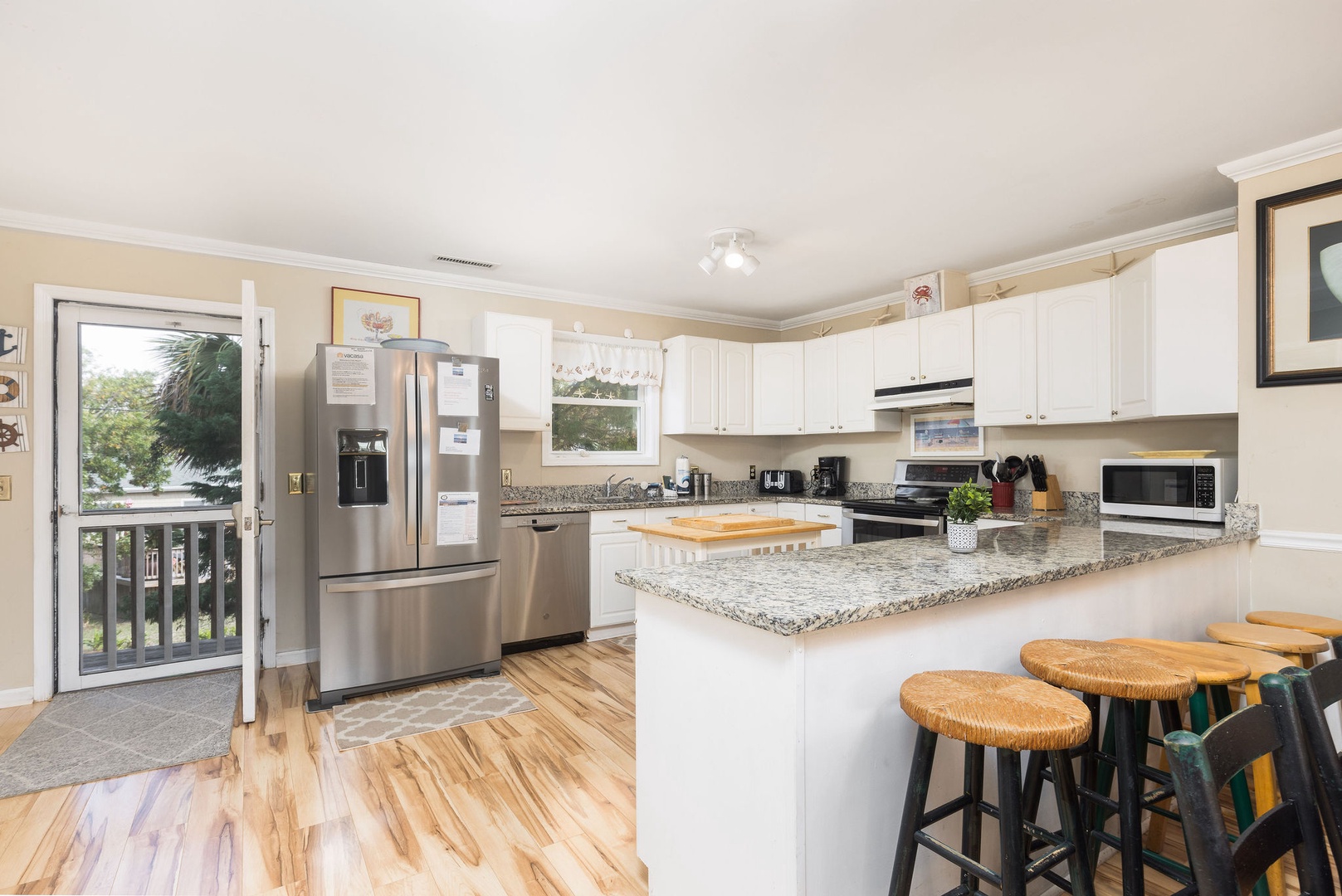 Kitchen: The fully equipped kitchen offers all the essentials, including a butcher block for additional counter space. With bar stools at the counter, it’s the perfect spot for friends to chat or kids to watch the cooking action. Prepare meals to enjoy on the screened-in back porch or pack up snacks for a beach day.