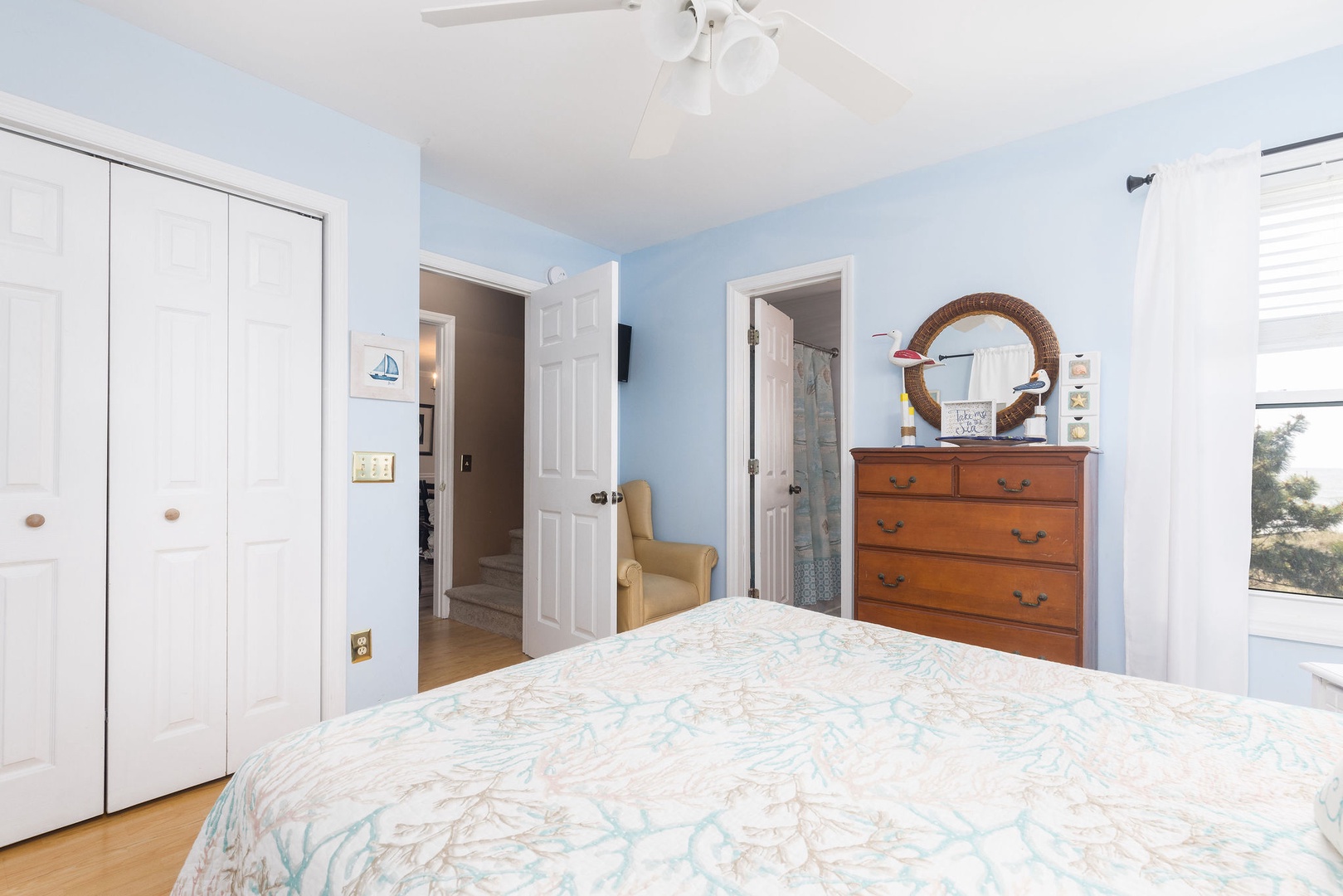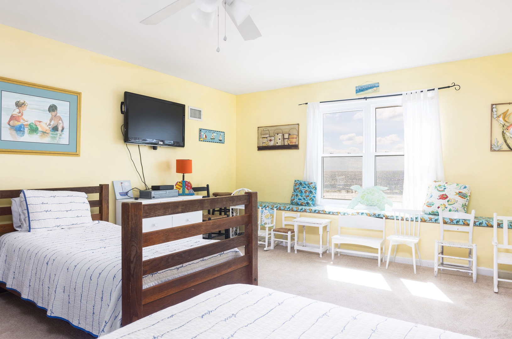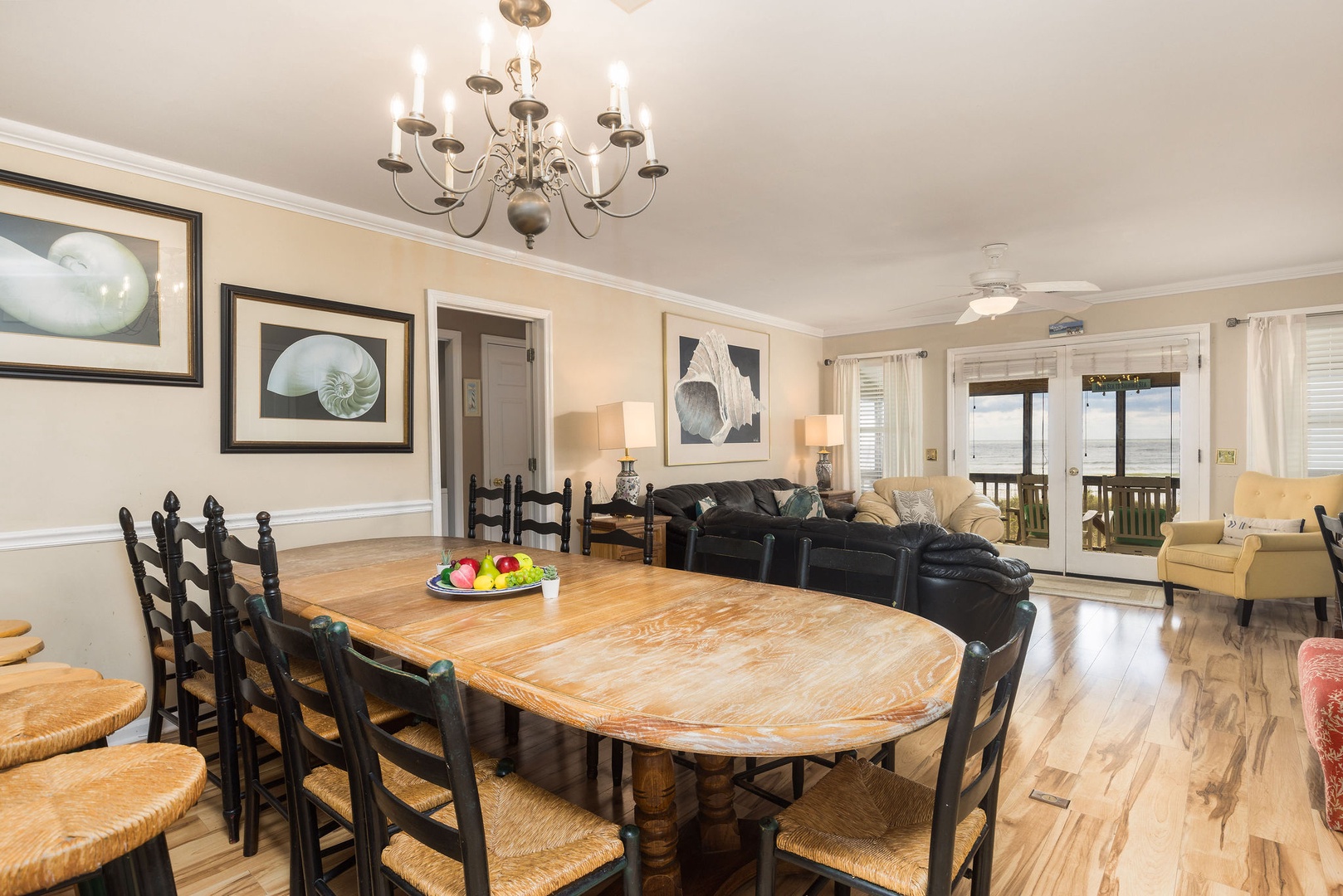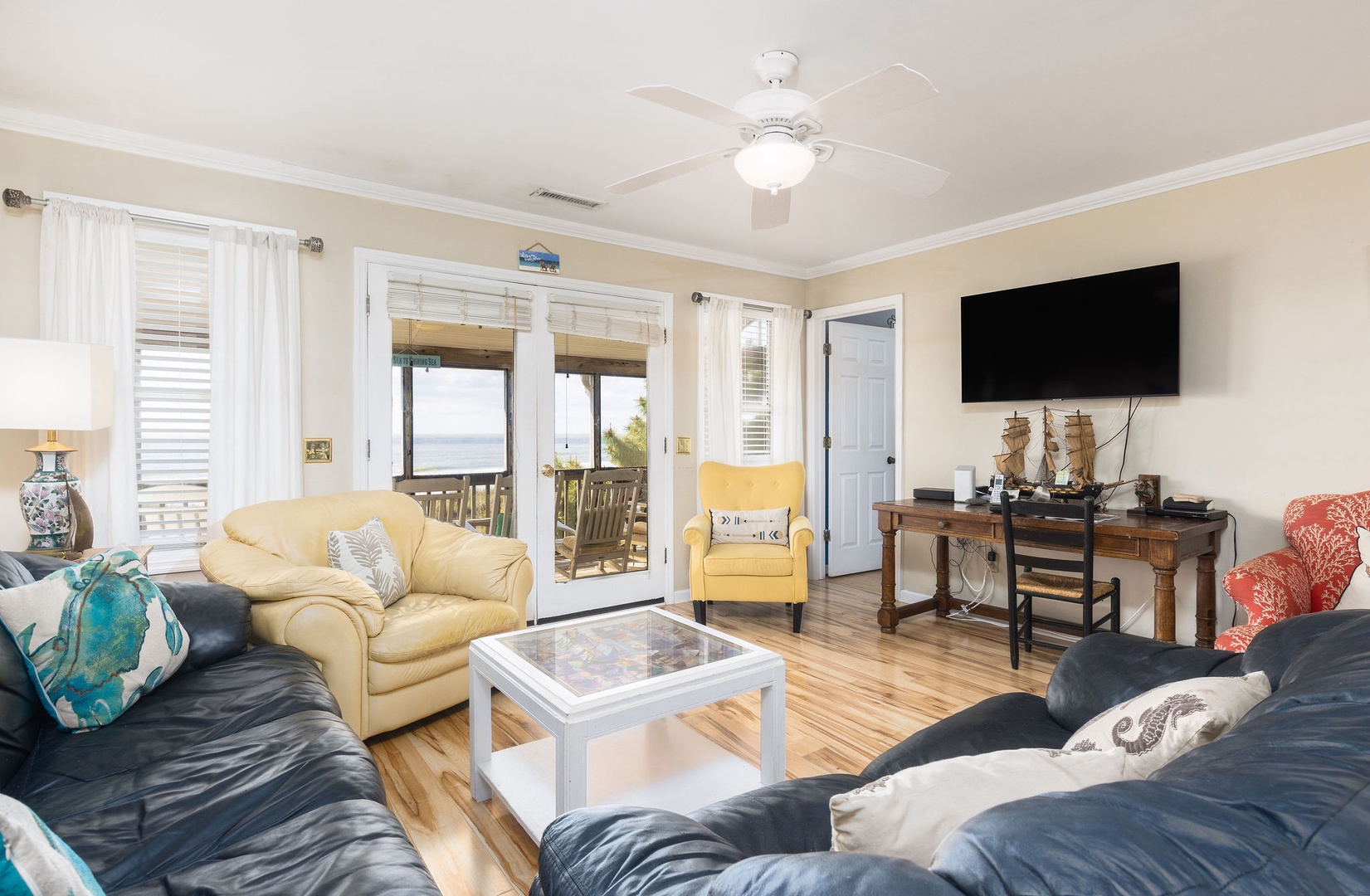 Living Area: The main level features an inviting dining area with a spacious table that has hosted countless meals, game nights, and reunions over the years. Adjacent to the dining area is a cozy living room, where you can enjoy both ocean views and entertainment on the TV—ideal for those rare rainy days.