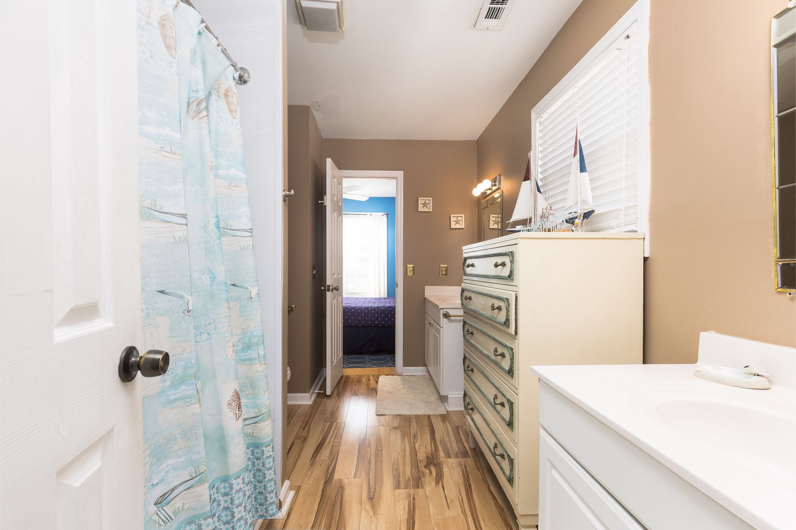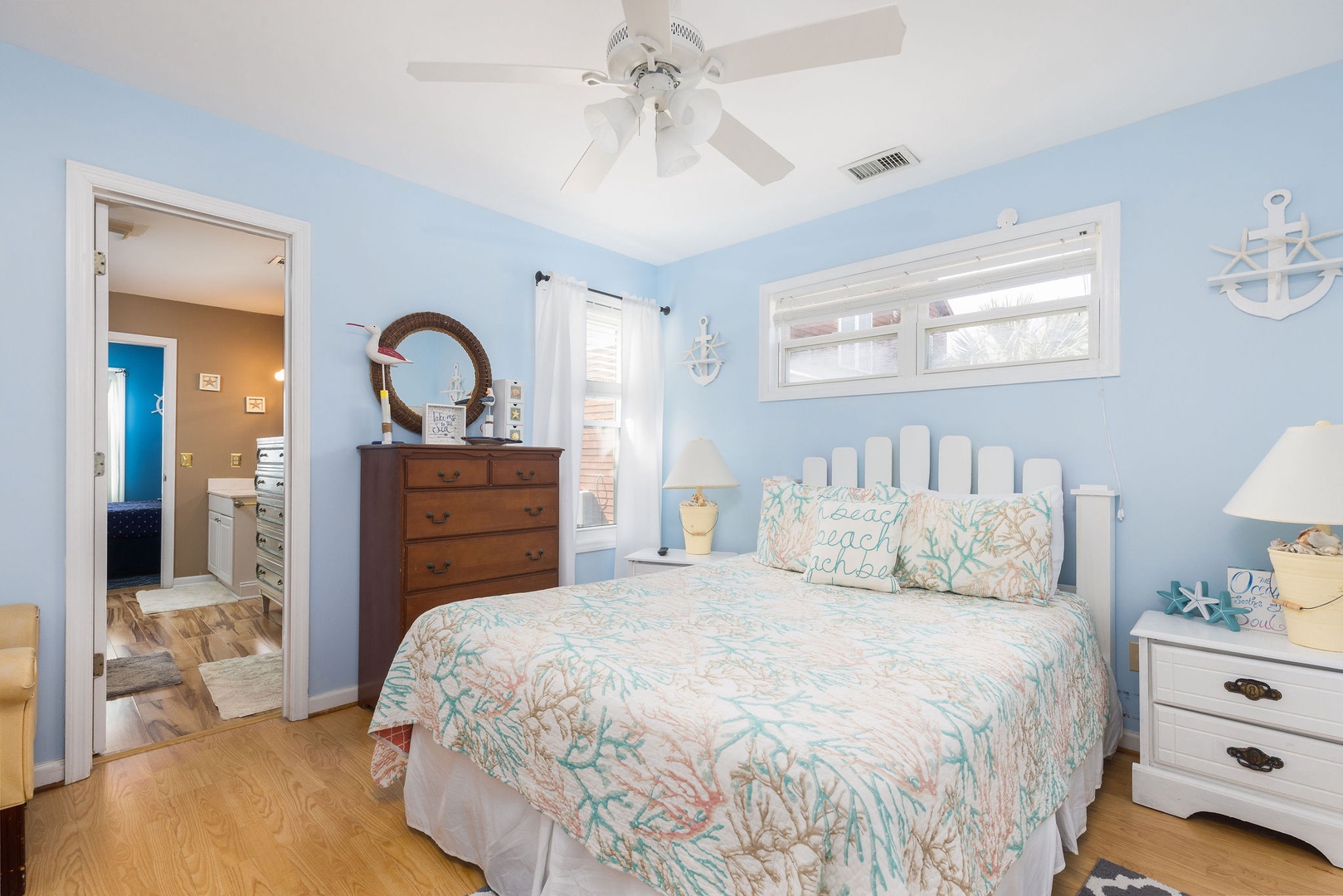Bedroom 1: Oceanfront Queen bed with access to a shared jack-and-jill bathroom.