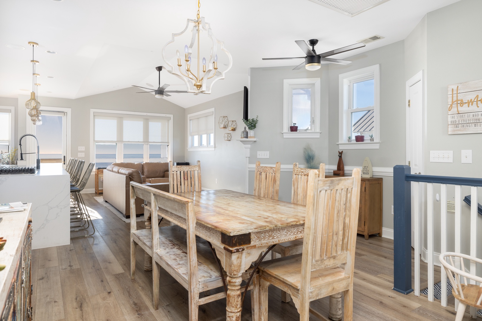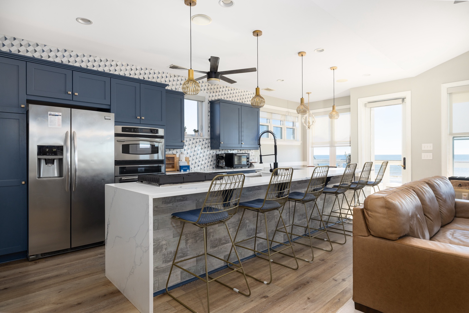 Living Area: The reverse floor plan places the open-concept living room and fully updated kitchen on the top floor, offering breathtaking ocean views. Large windows and glass doors provide abundant natural light, making this a perfect space to unwind and enjoy the scenery. The kitchen features a spacious island with additional seating and a dining table that accommodates seven. A small round table off the kitchen is perfect for morning coffee (Drip, Nespresso, and K-cup available) and planning your day.