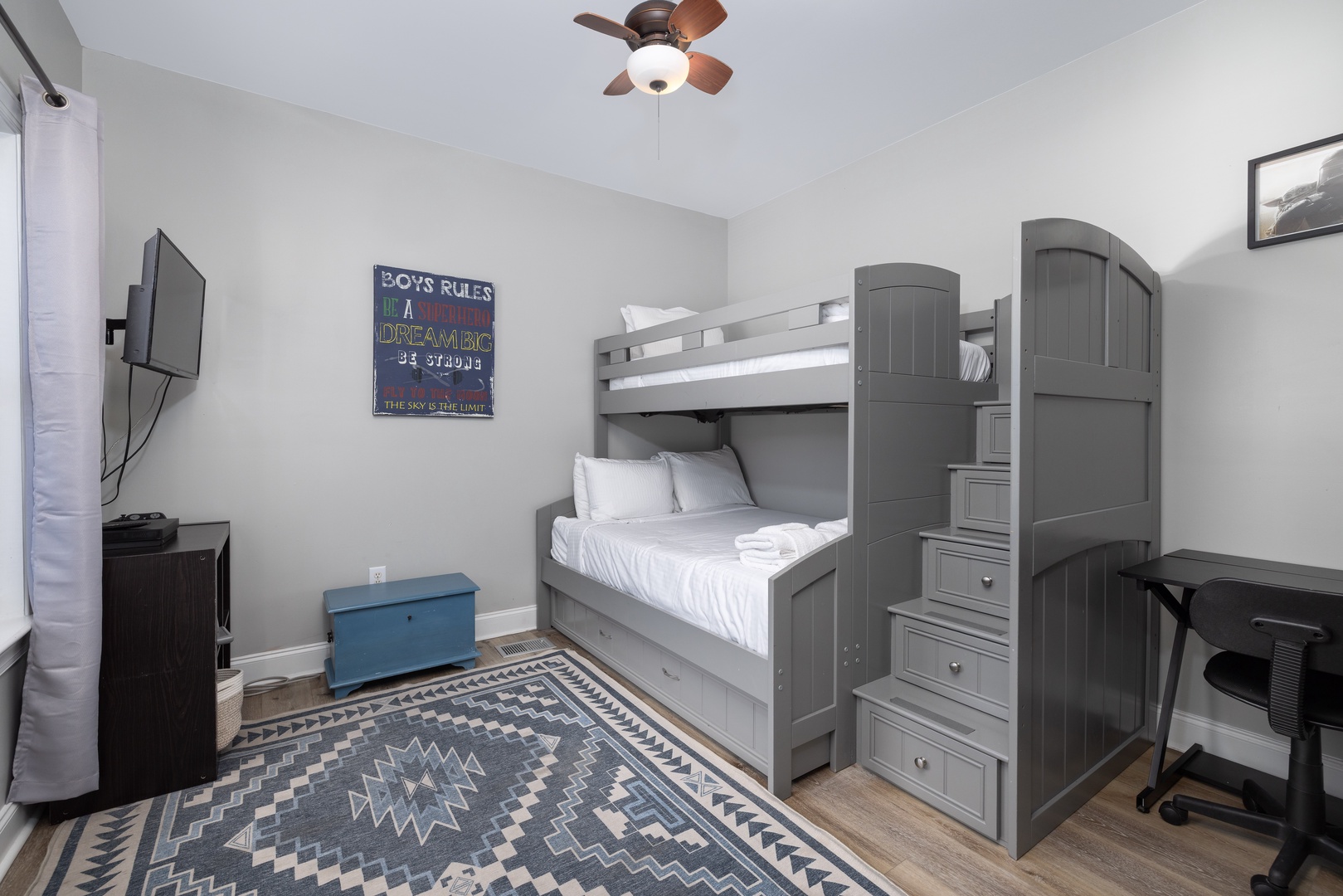 Your kids will love their own cozy bedroom with sturdy bunk beds and entertainment setup for restful nights.