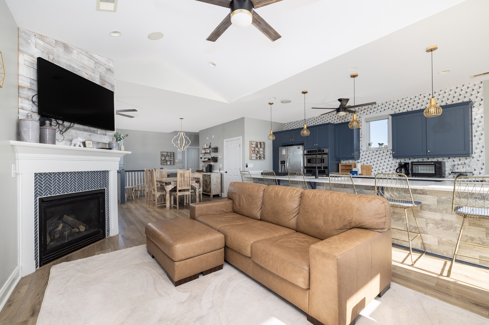 Sink into plush leather seating by your cozy fireplace, where natural light streams through large windows and ceiling fans keep you perfectly comfortable.