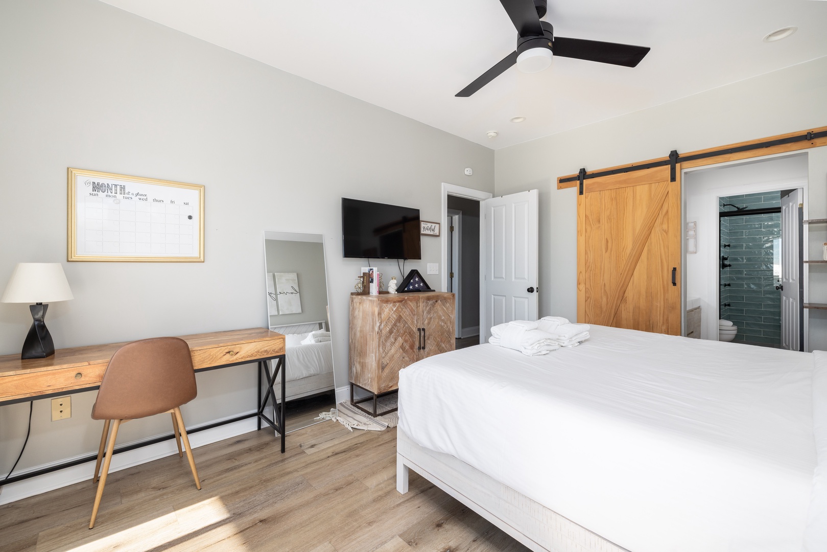 Sink into crisp white linens in your modern bedroom, complete with workspace, ceiling fan, and stylish barn door leading to your private bathroom.