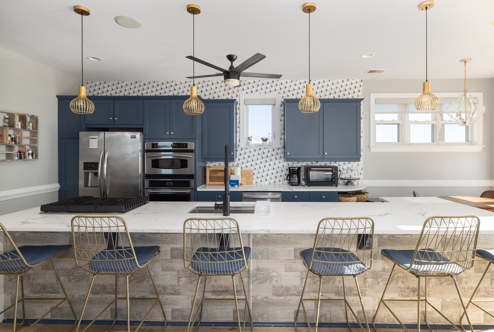 Your spacious kitchen invites culinary adventures with stunning blue cabinetry, gleaming quartz countertops, and modern appliances ready for your favorite recipes.