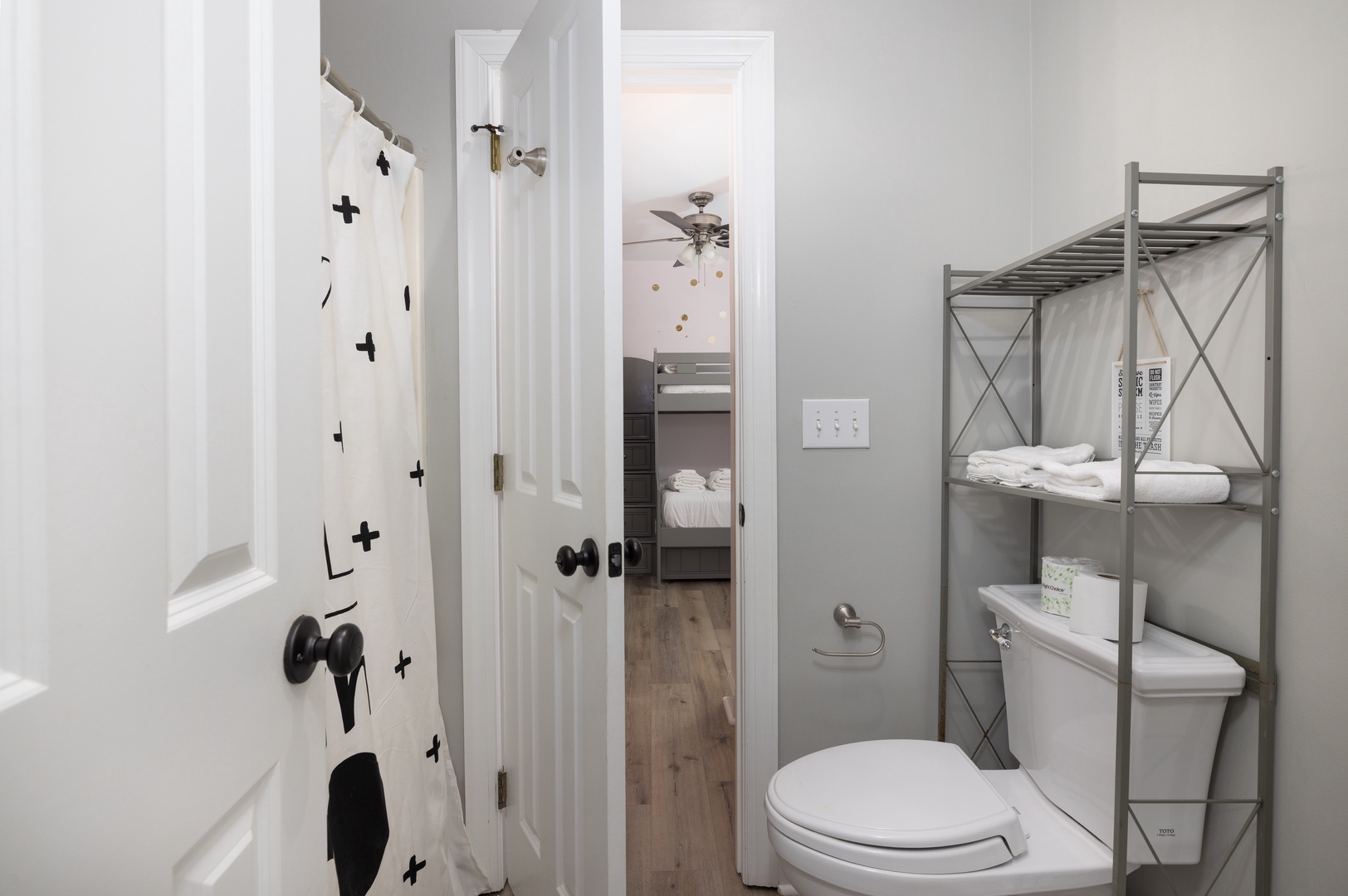 Your bright bathroom features modern fixtures and thoughtful storage, with a playful shower curtain adding personality to your refreshing space.
