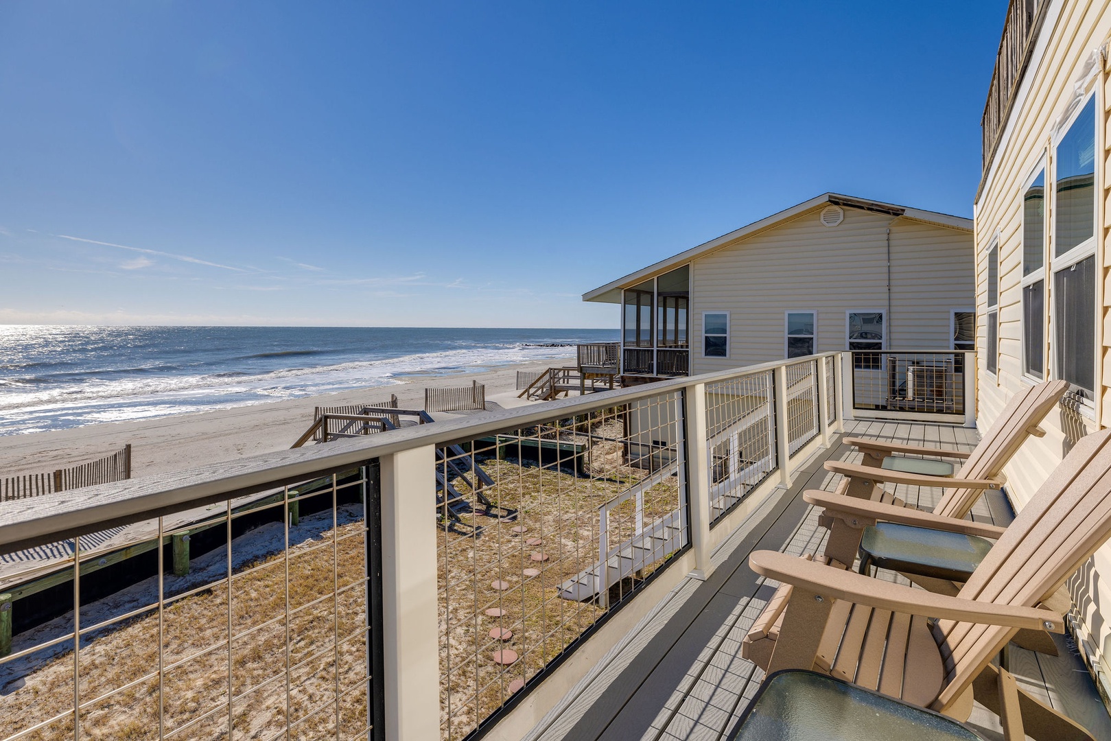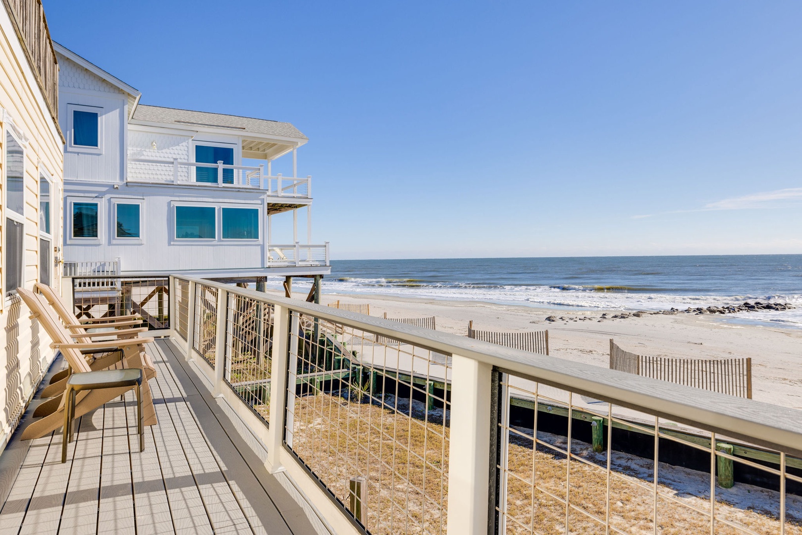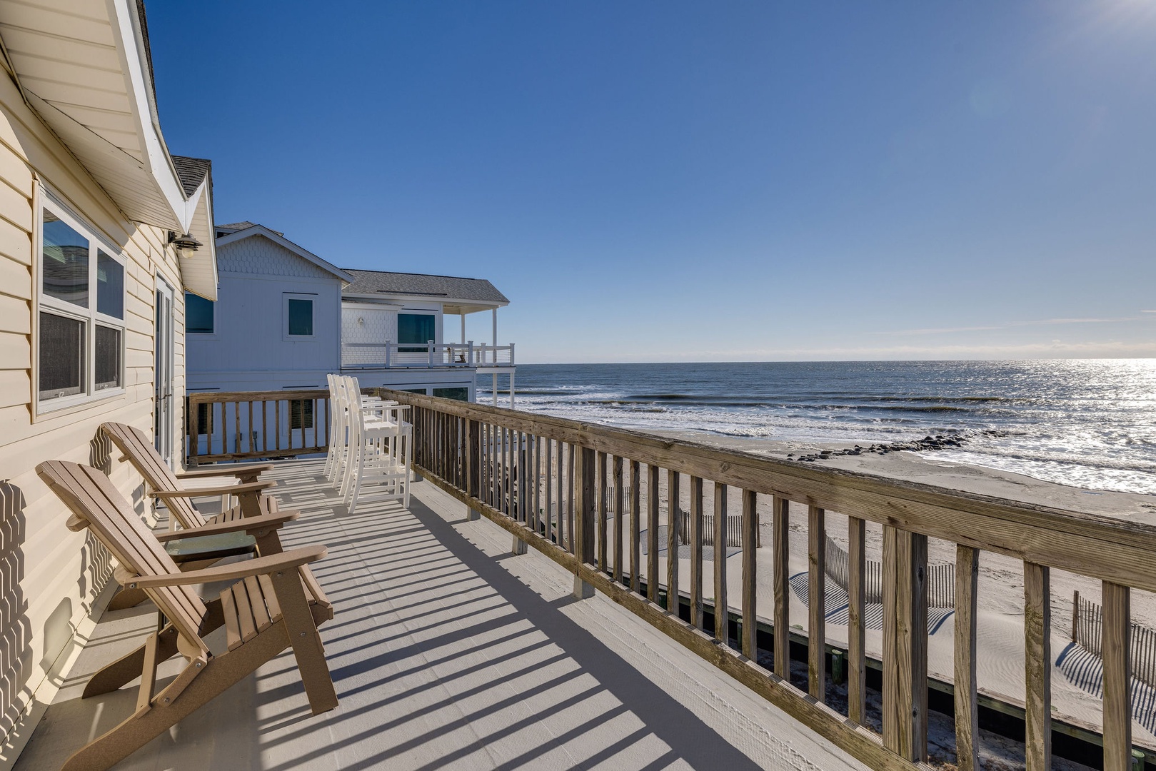 The expansive oceanfront deck is ideal for relaxing and taking in panoramic beach views. Enjoy the hammocks for a perfect afternoon nap or stargazing under the night sky.