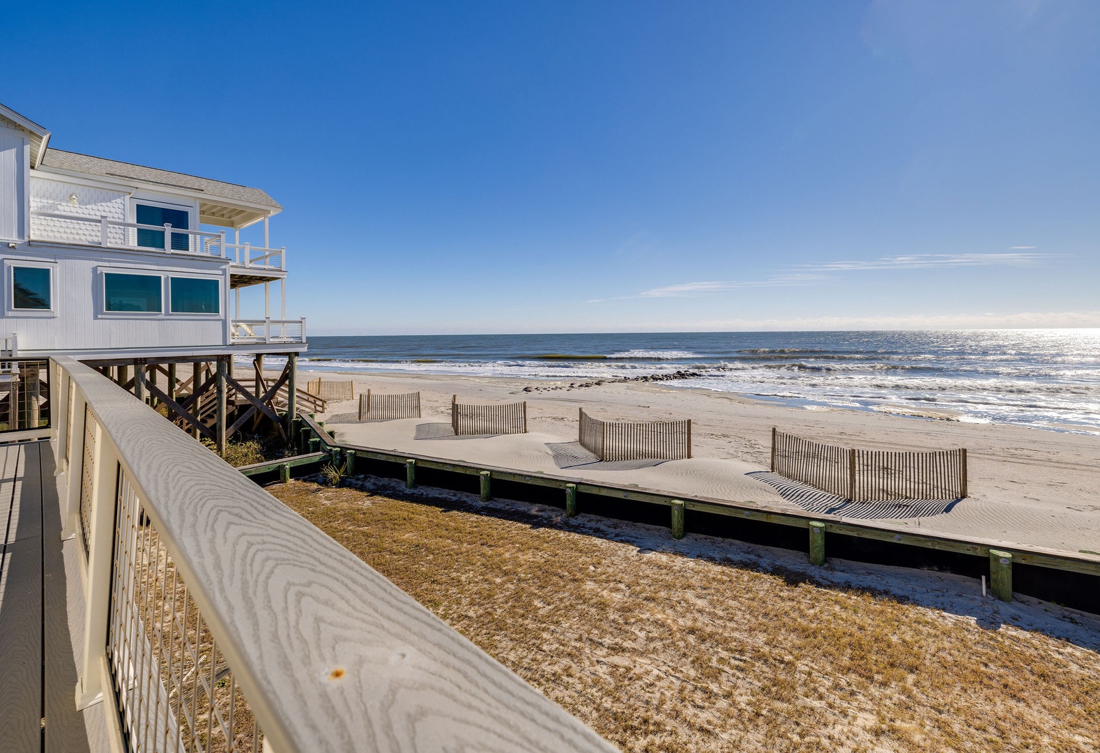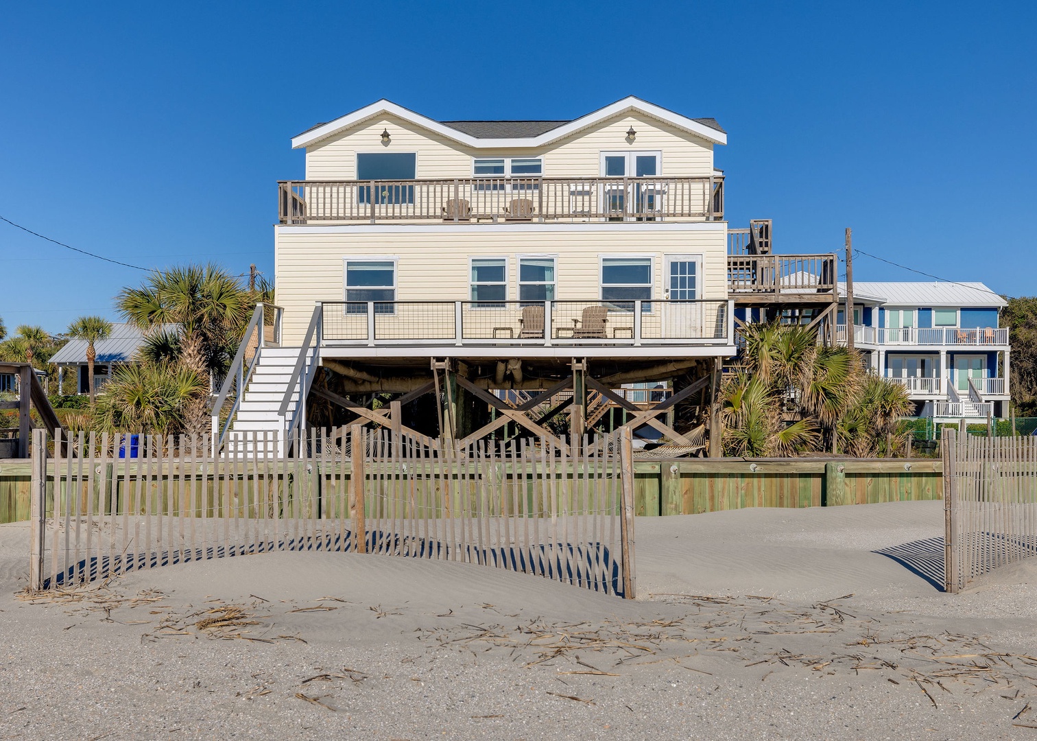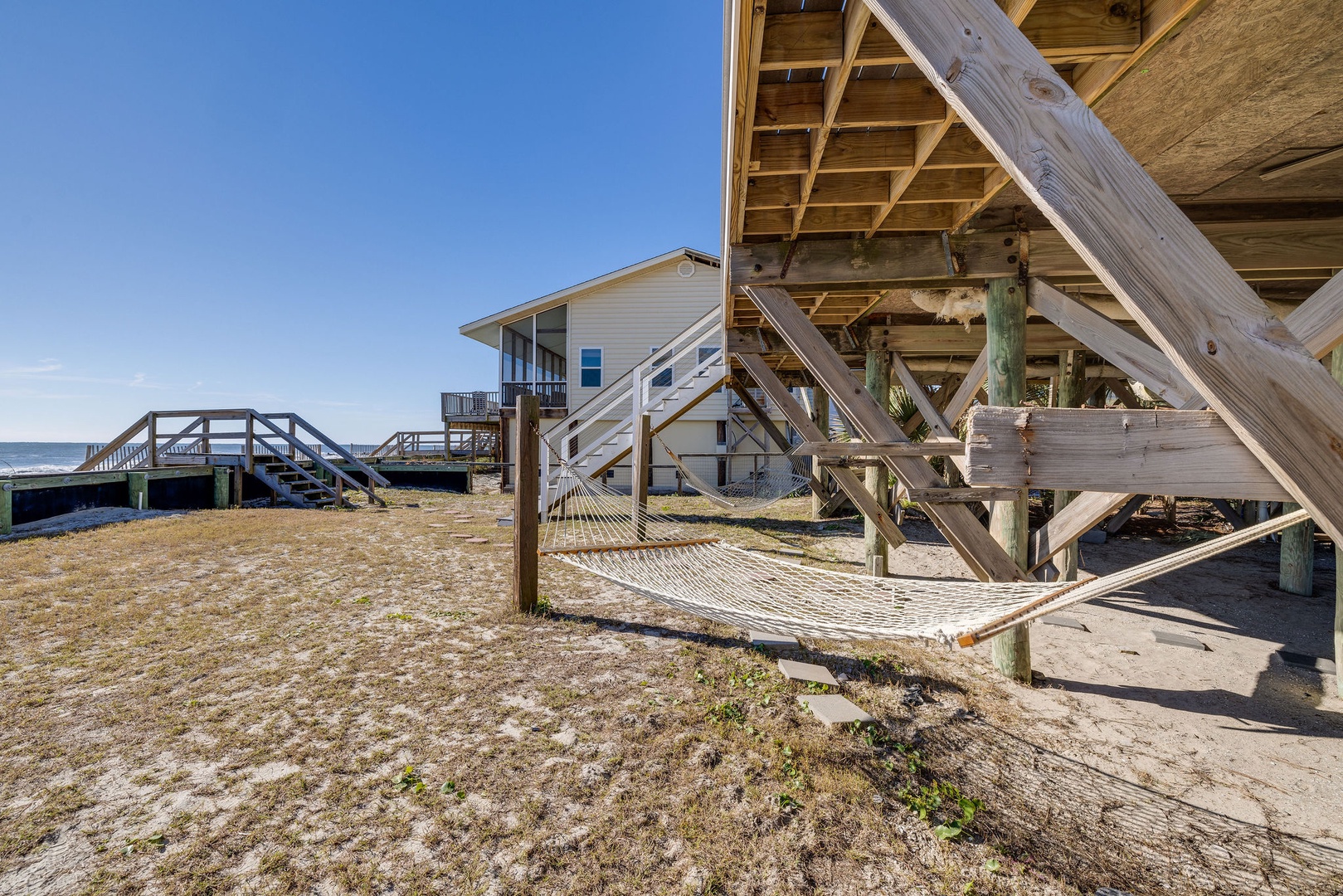 The expansive oceanfront deck is ideal for relaxing and taking in panoramic beach views. Enjoy the hammocks for a perfect afternoon nap or stargazing under the night sky.