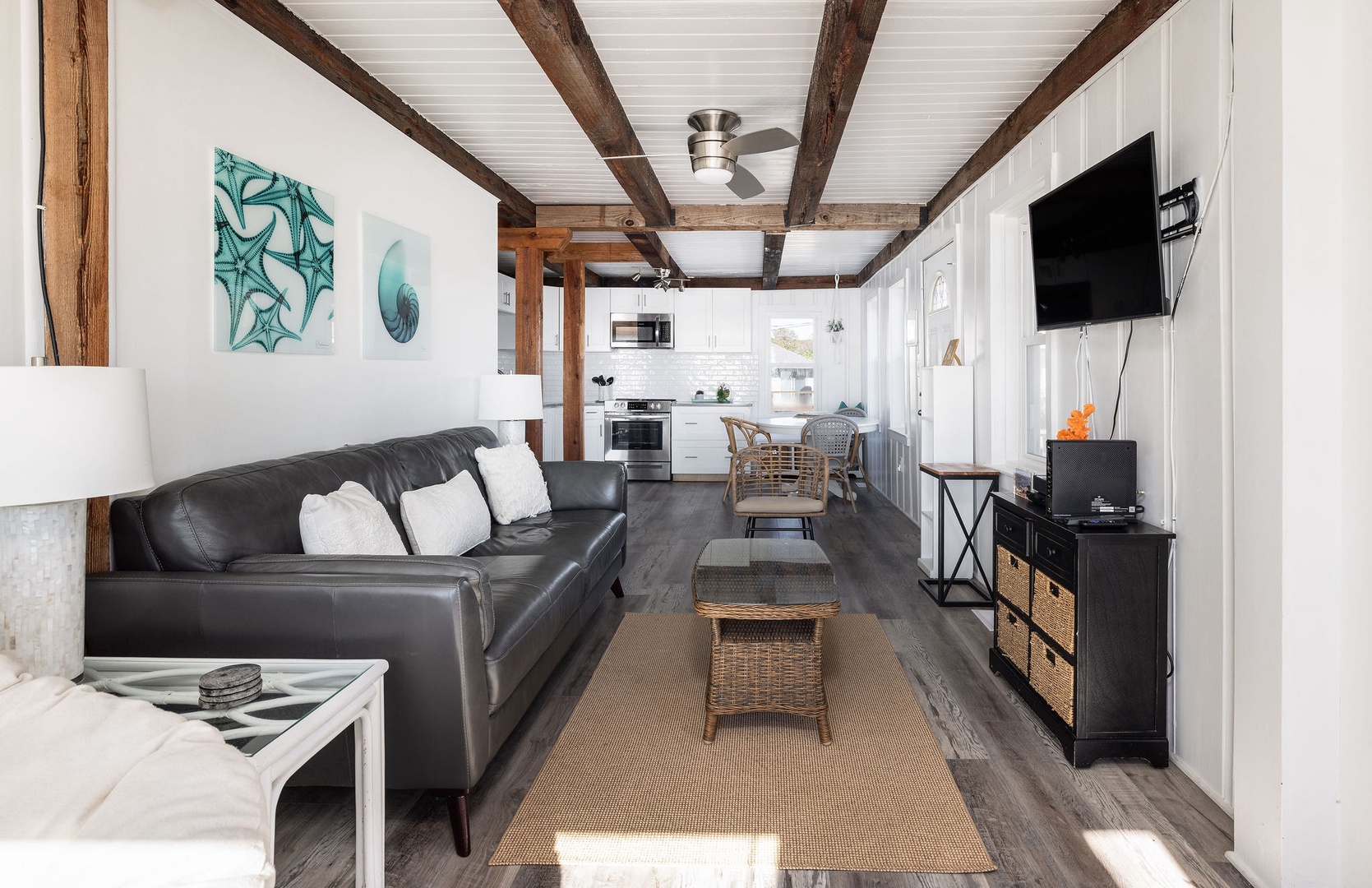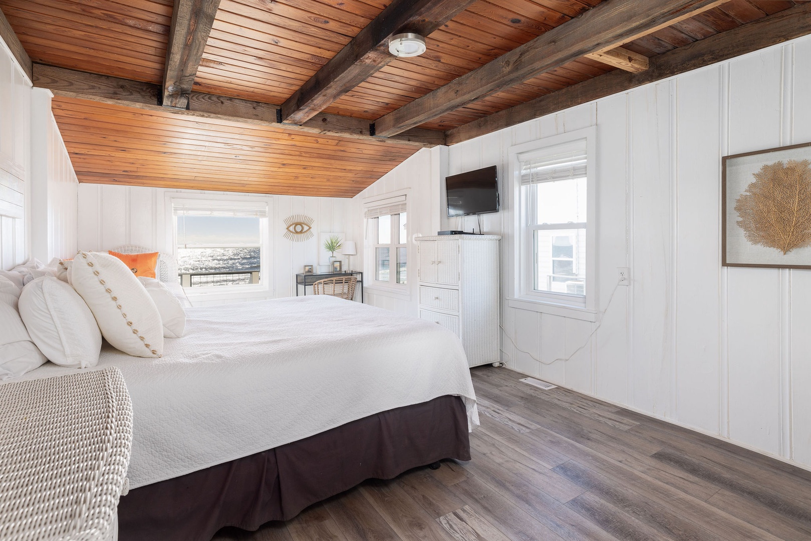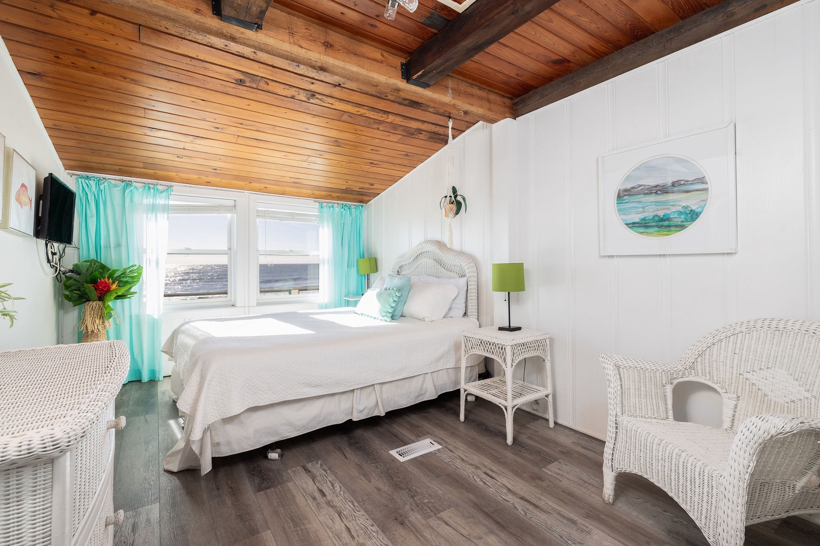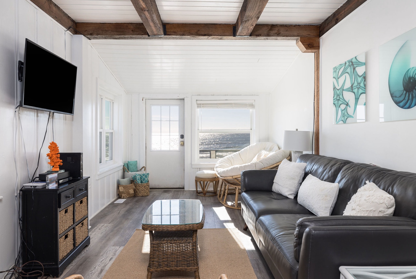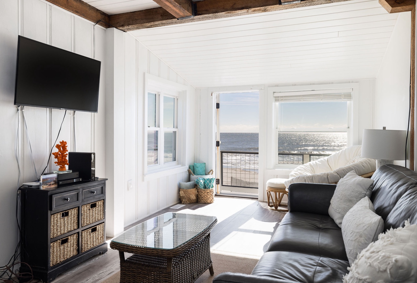 The living area is open and bright, with stunning ocean views and cozy seating, creating a tranquil space to unwind. Relax indoors or step out onto the deck to enjoy the sea breeze and stunning scenery.