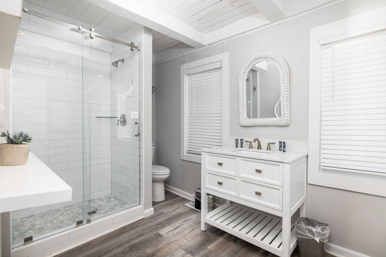 The renovated bathroom features a luxurious shower and modern fixtures, offering a refreshing retreat after a day at the beach.
