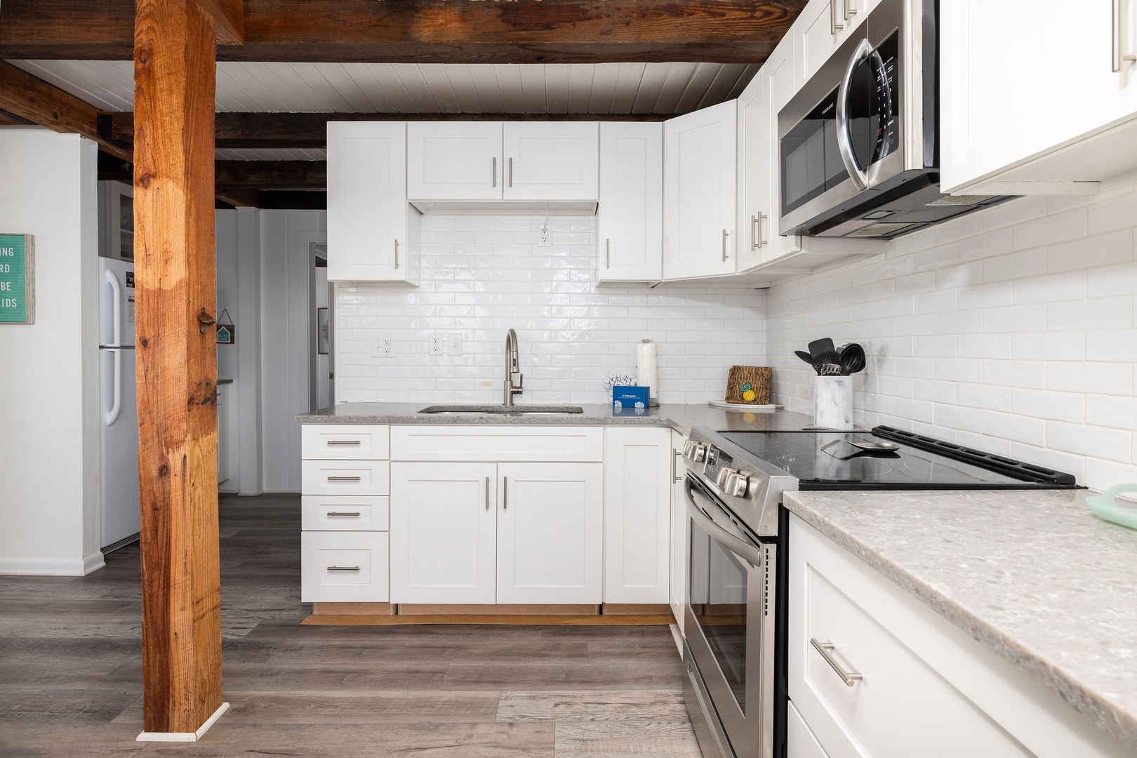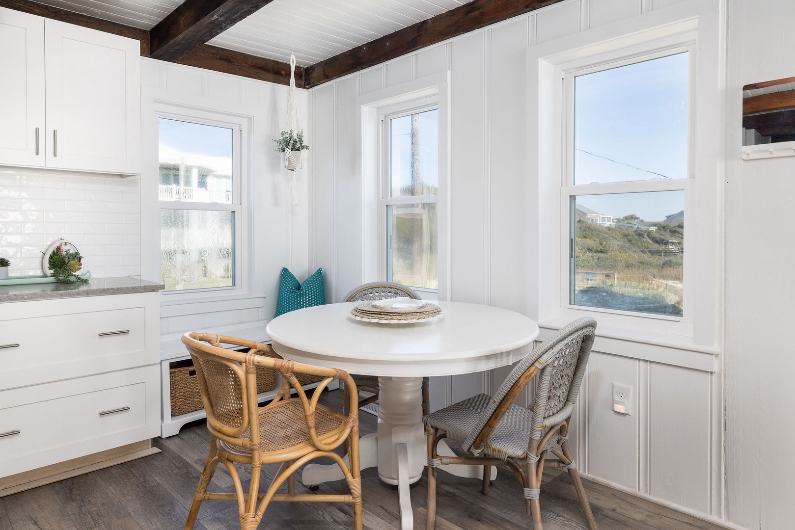 The well-equipped kitchen includes essential appliances and ample counter space, offering beautiful ocean views as you prepare meals. (Please note, there is no dishwasher in this unit.)