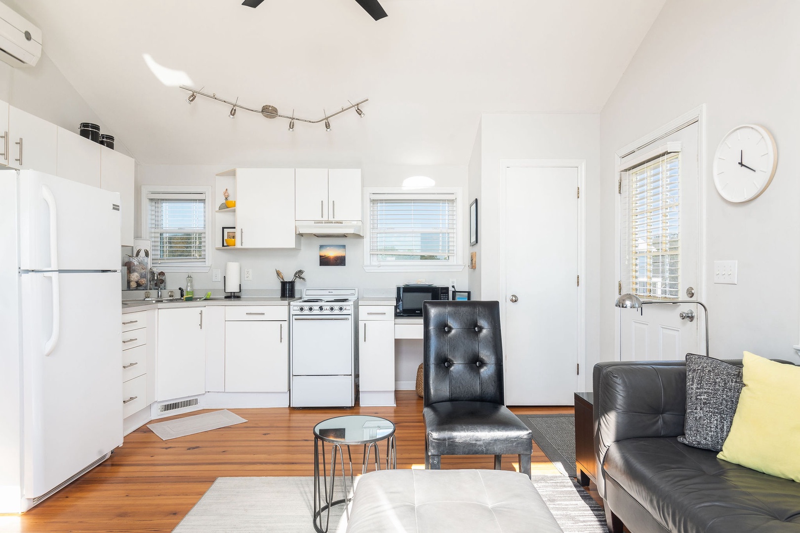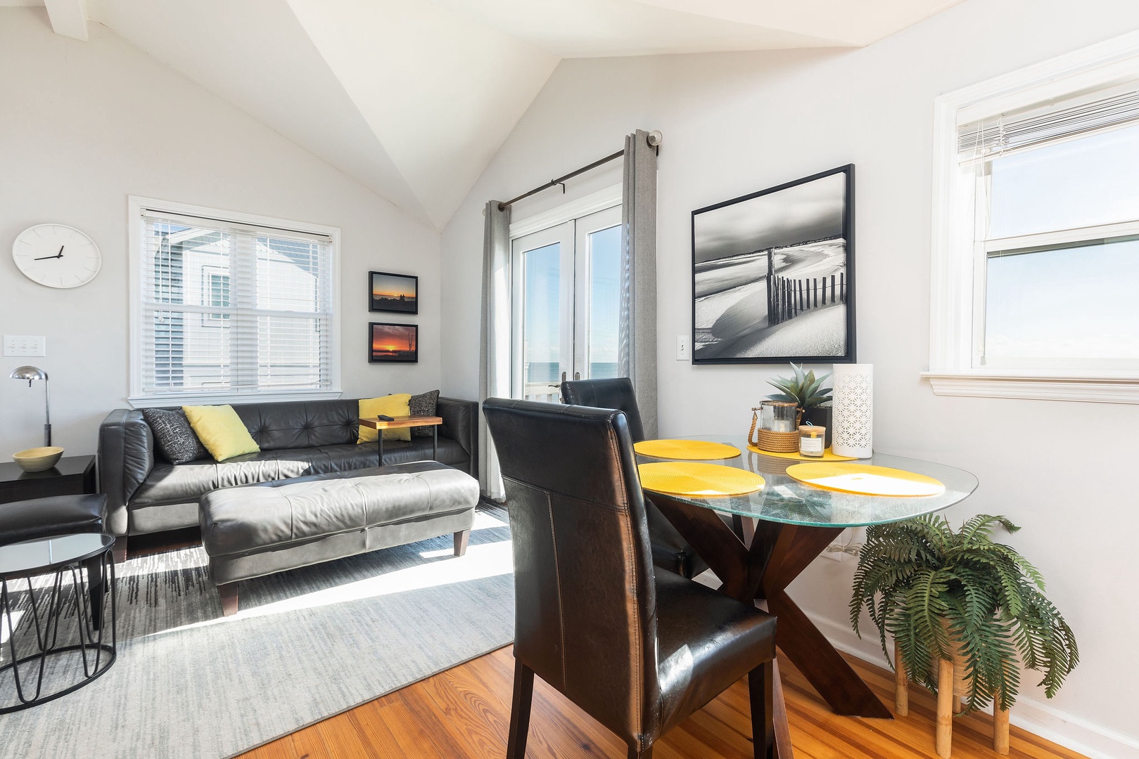 The bright and open living area provides a comfortable spot to relax and enjoy the beautiful ocean view. The open layout seamlessly connects to the kitchen, making it easy to enjoy the sights and sounds of the beach even while indoors.