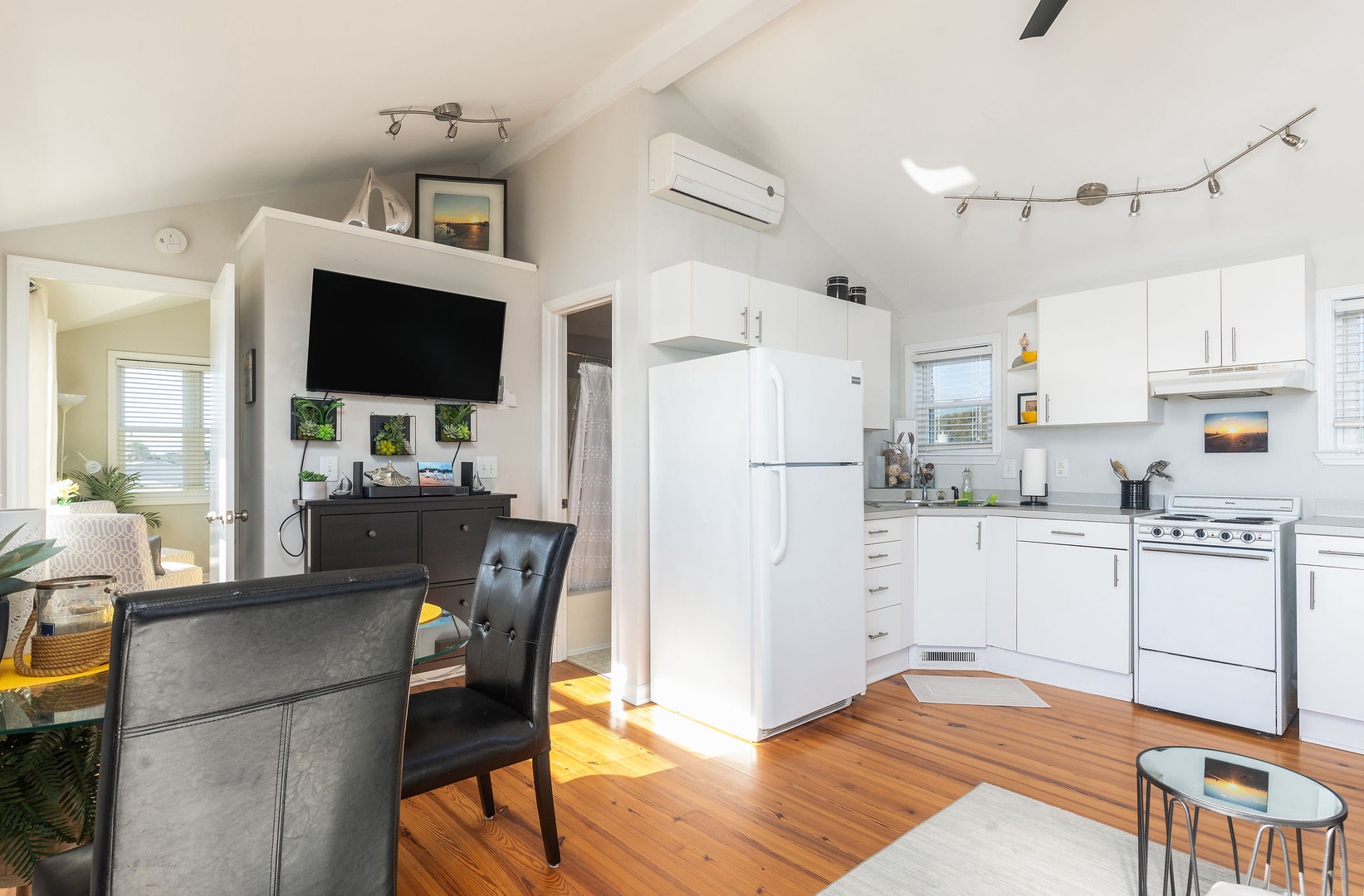 The kitchen is equipped with essential appliances and ample counter space, perfect for preparing meals while taking in the ocean view.