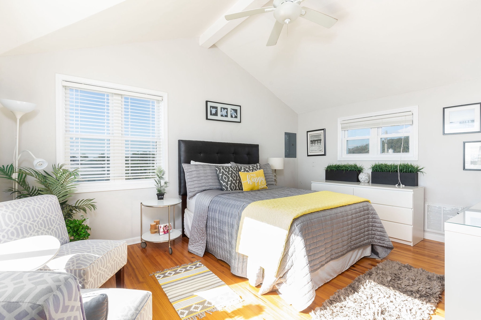Primary Bedroom: Queen bed with a view of the ocean, providing a peaceful retreat for restful nights and beautiful morning sunrises.