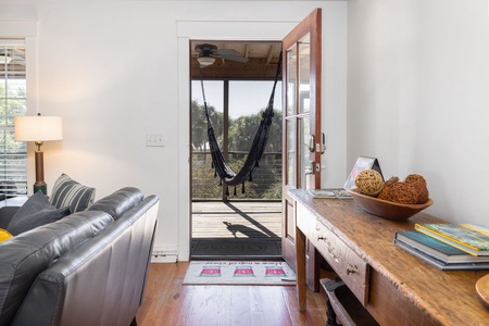 Front porch: Large screened-in area with a comfy couch, chairs, and hammock to enjoy the ocean breeze.