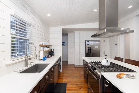 Sleek chef’s kitchen with gas range, farmhouse sink, and crisp white shiplap walls — the perfect blend of style and function in your Folly Beach vacation home.