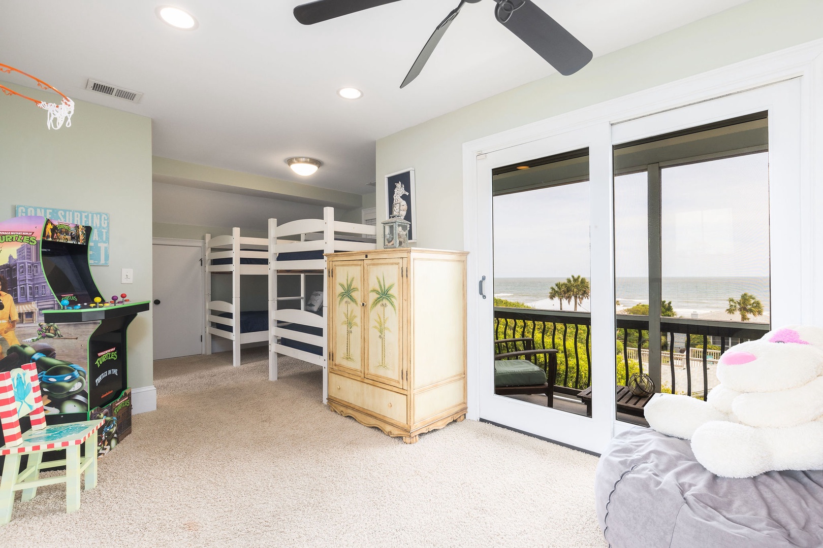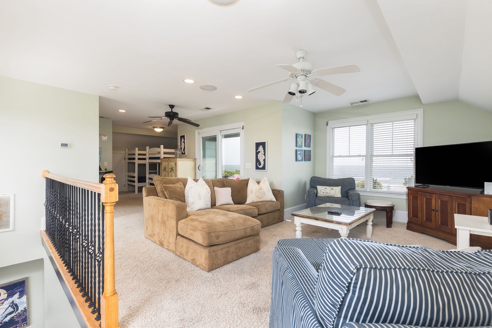 Third Floor: Two bunk beds, private bath, and a cozy living area with ocean views and a small deck.