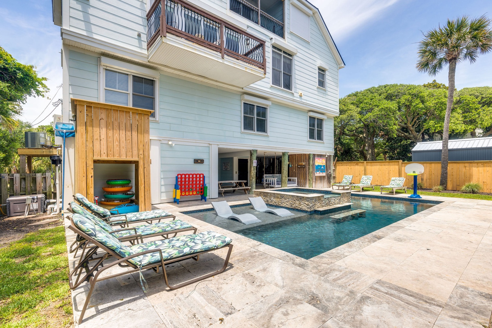 High Tide Private Pool Oasis – Enjoy a resort-style experience with in-water loungers, a sun-soaked deck, and plenty of seating just steps from the beach in Folly Beach, SC
