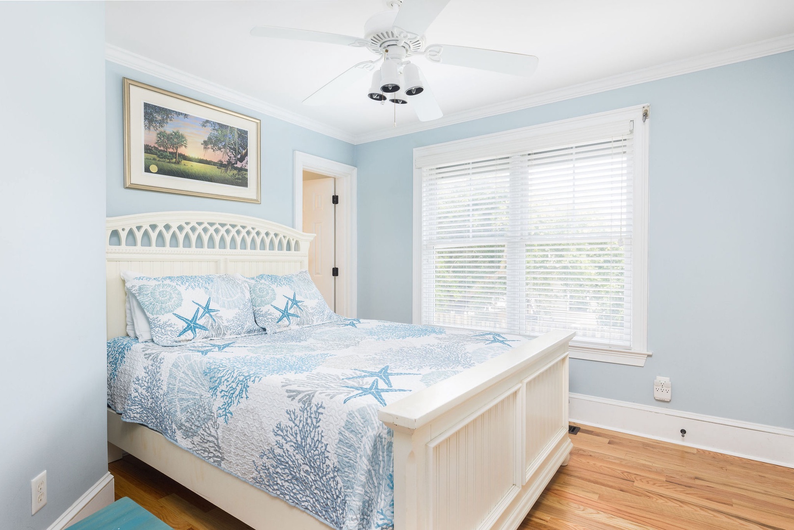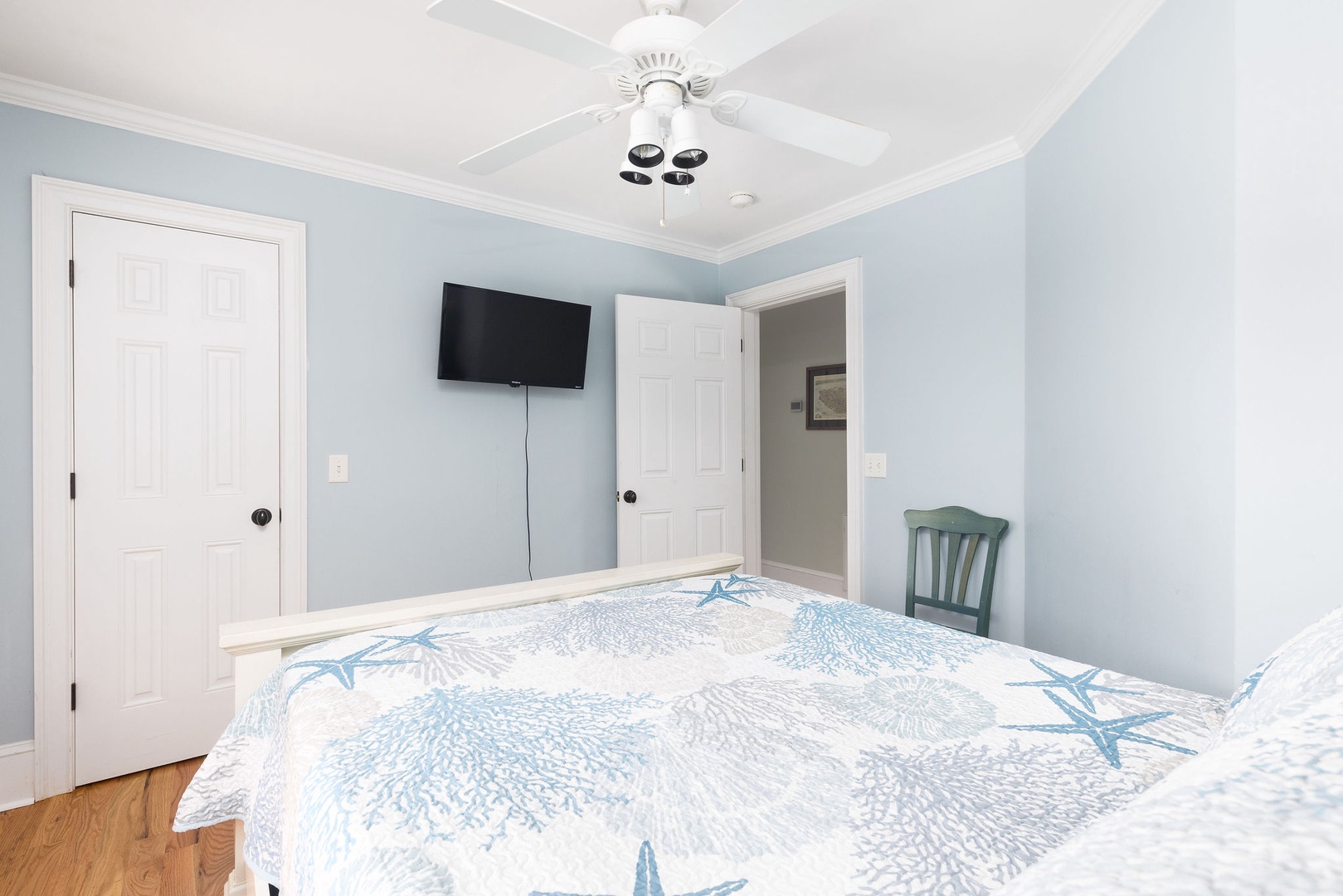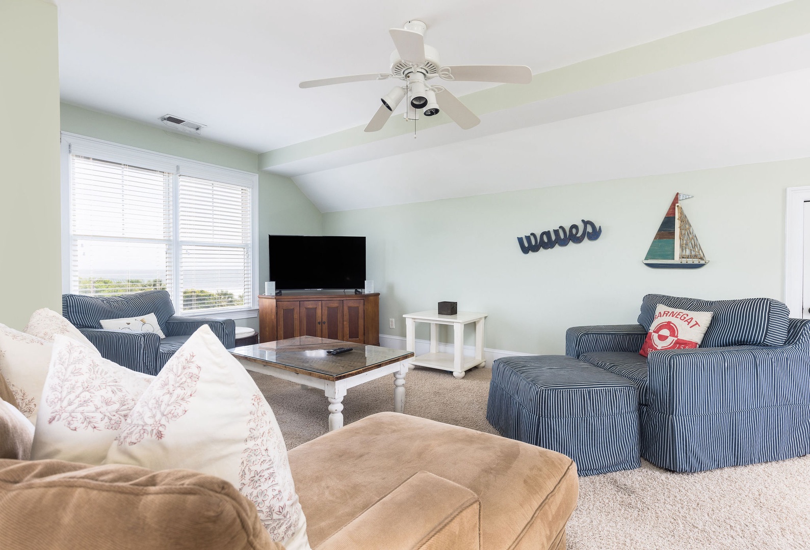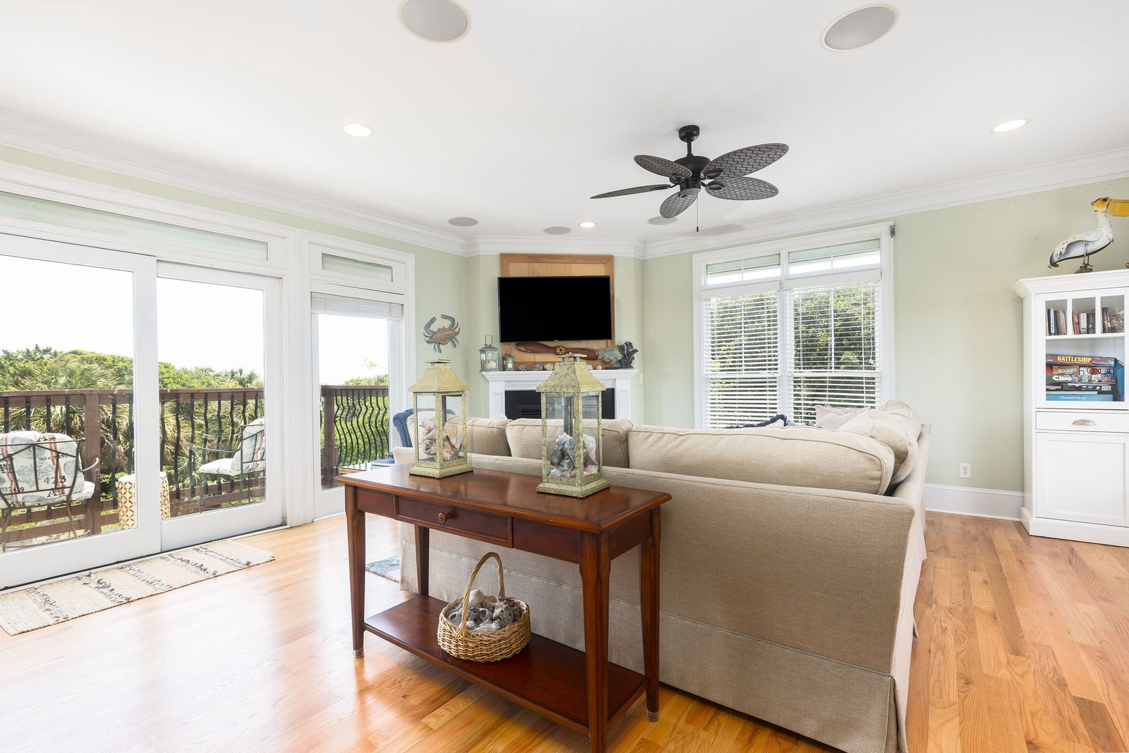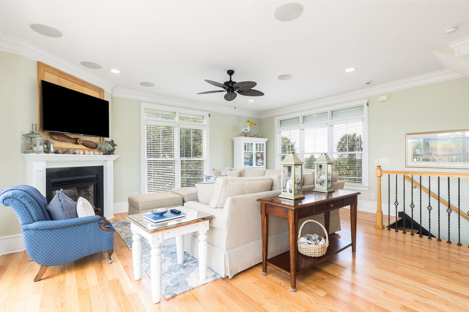 Gather with friends and family in this airy living area featuring a flat-screen TV, hardwood floors, and beach-inspired décor.