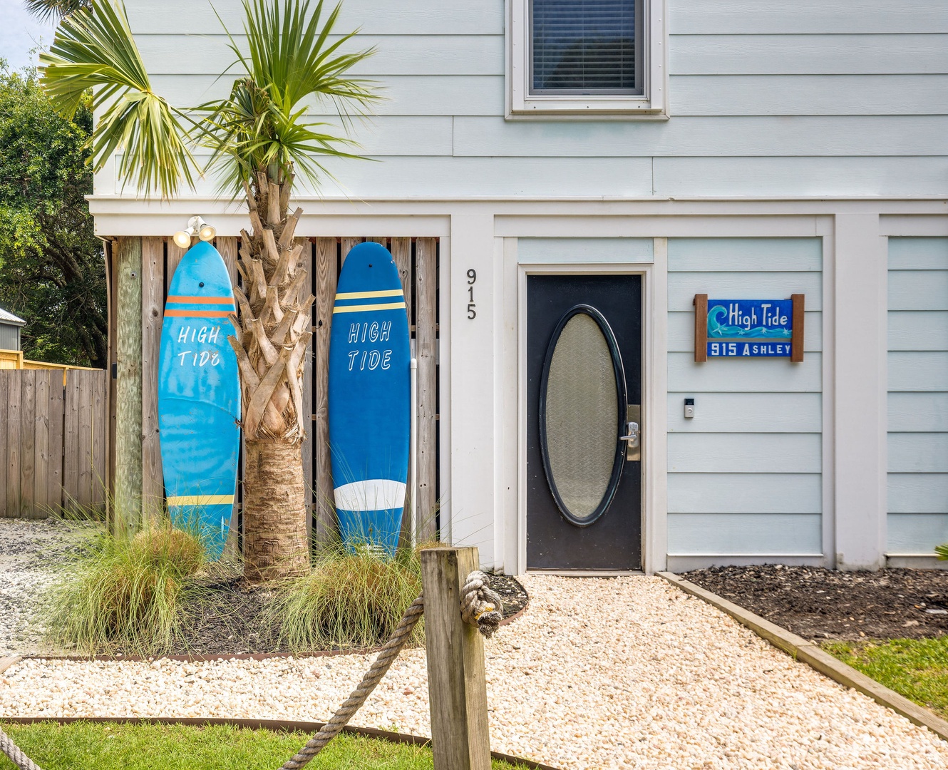 Welcome to High Tide – Surfboard décor and palm landscaping set the tone for your beach stay