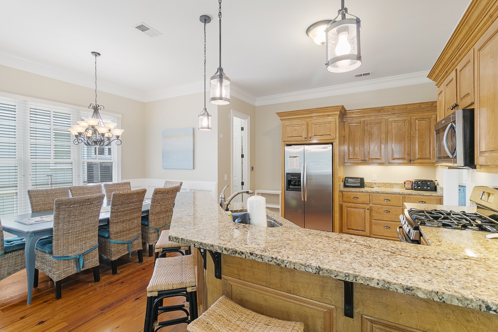 The fully equipped kitchen features modern appliances, ample counter space, and a view of the living and dining areas. With seating for 10 at the dining table, it’s perfect for meals and entertaining.