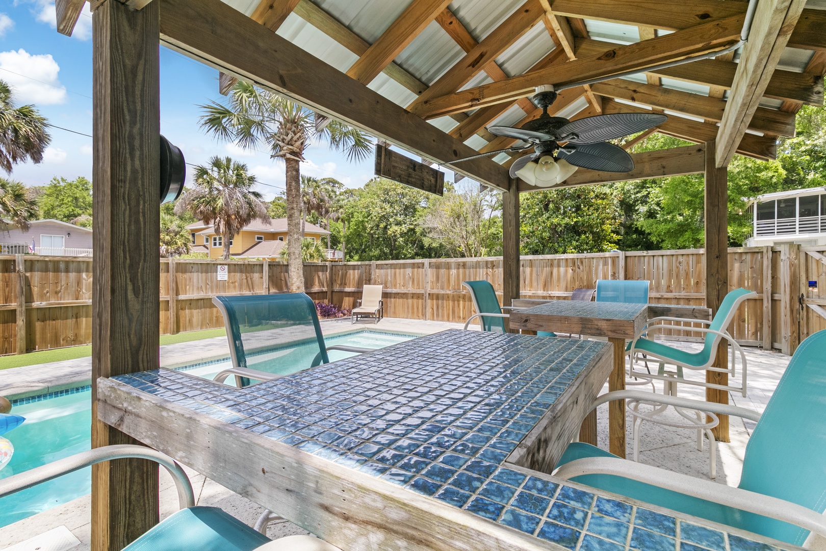Covered poolside cabana with a tiled dining table, perfect for shaded meals and cocktails