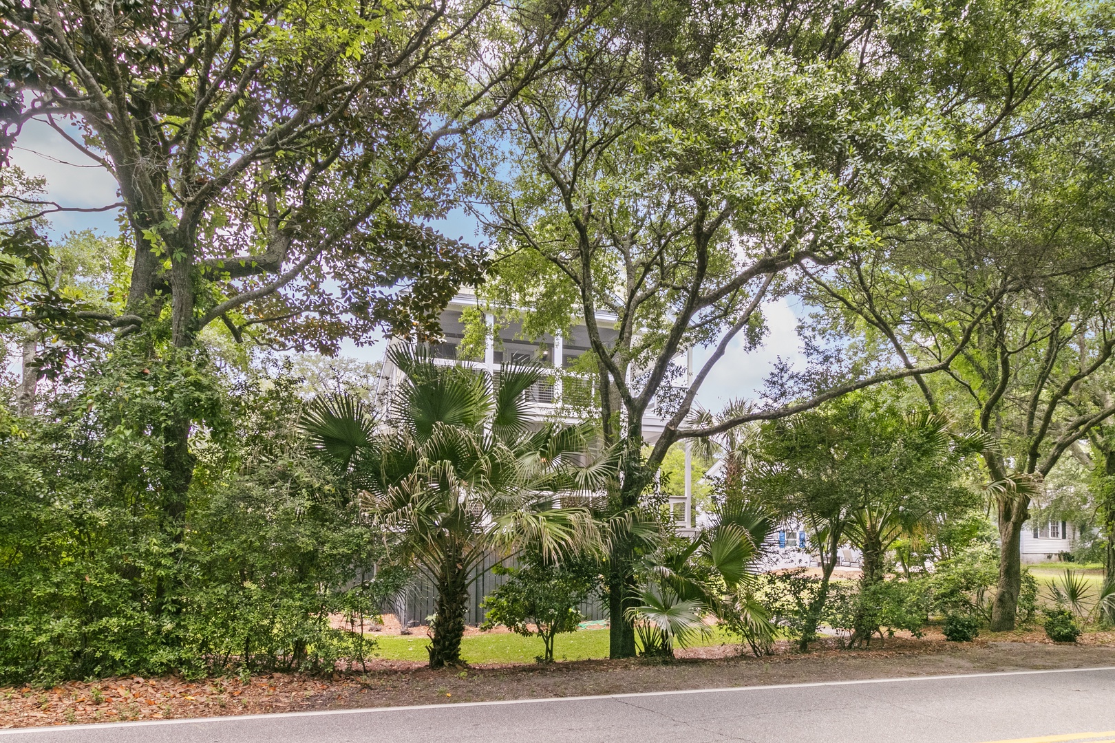 Okeanos Aerial View on Folly Beach – Stunning bird’s-eye perspective showcasing the private pool, lush tropical landscaping, and prime location just steps from the Atlantic Ocean -