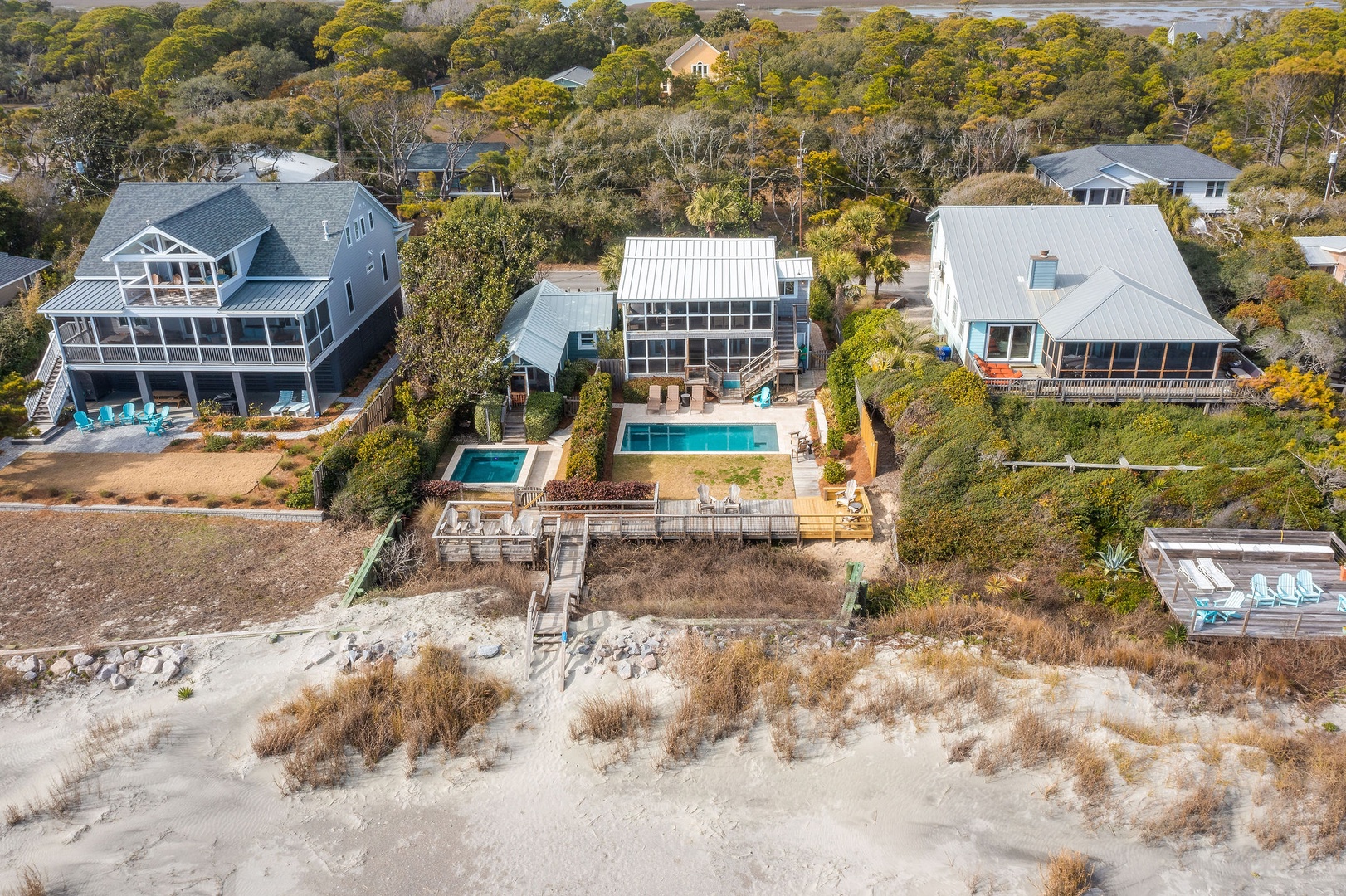 The Drips Collection offers a unique blend of Drip Dry Up, Drip Dry Down, and Little Drip, combining to create the perfect oceanfront retreat at 1311 East Ashley Ave, Folly Beach, SC. This exceptional collection is ideal for extended families, large groups, or friends seeking a versatile and comfortable getaway with stunning ocean views, private beach access, and shared amenities like a heated pool & plunge pool.