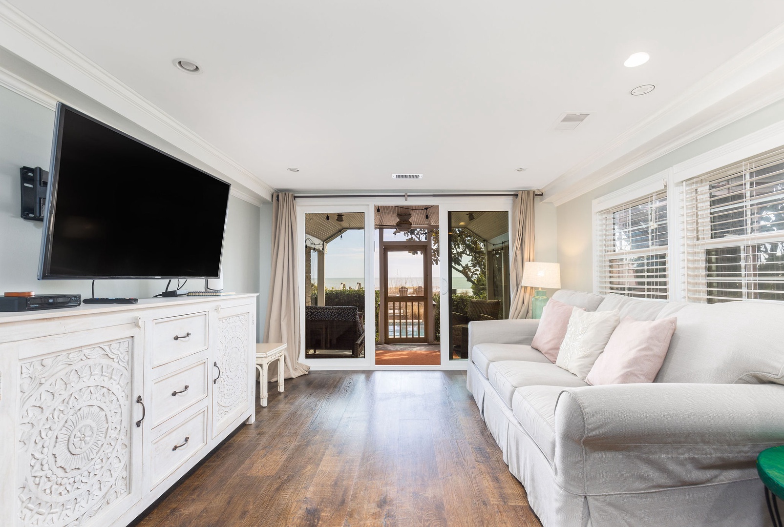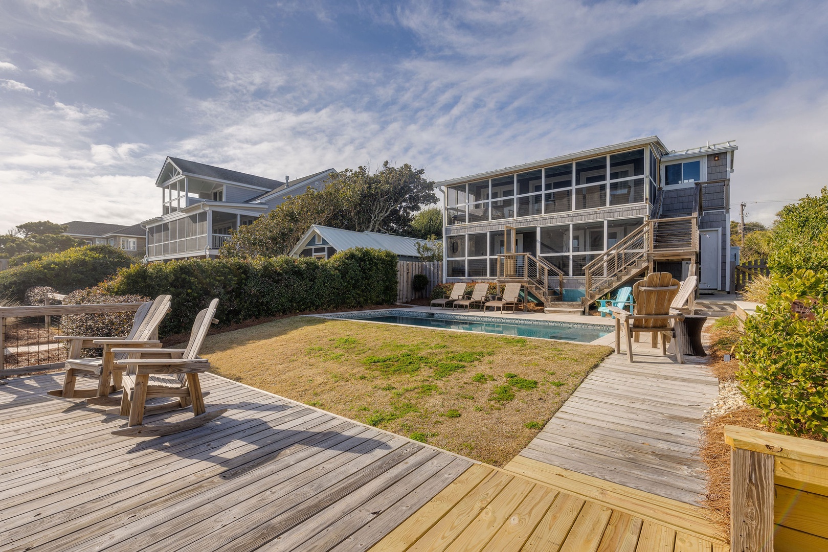 Outdoor Amenities: Shared heated pool, private beach access, and spacious outdoor living areas.