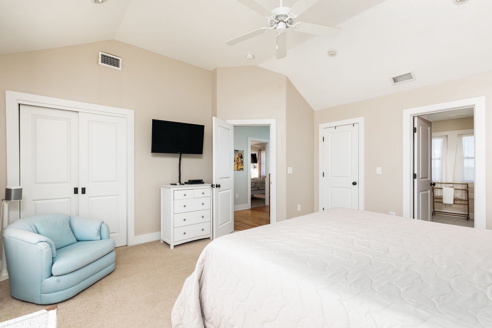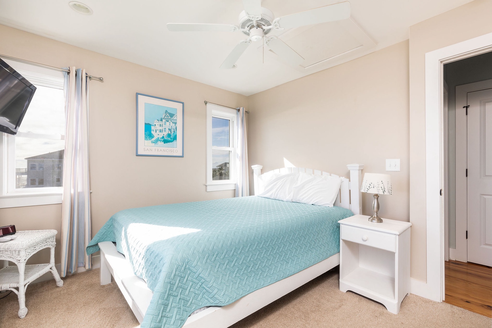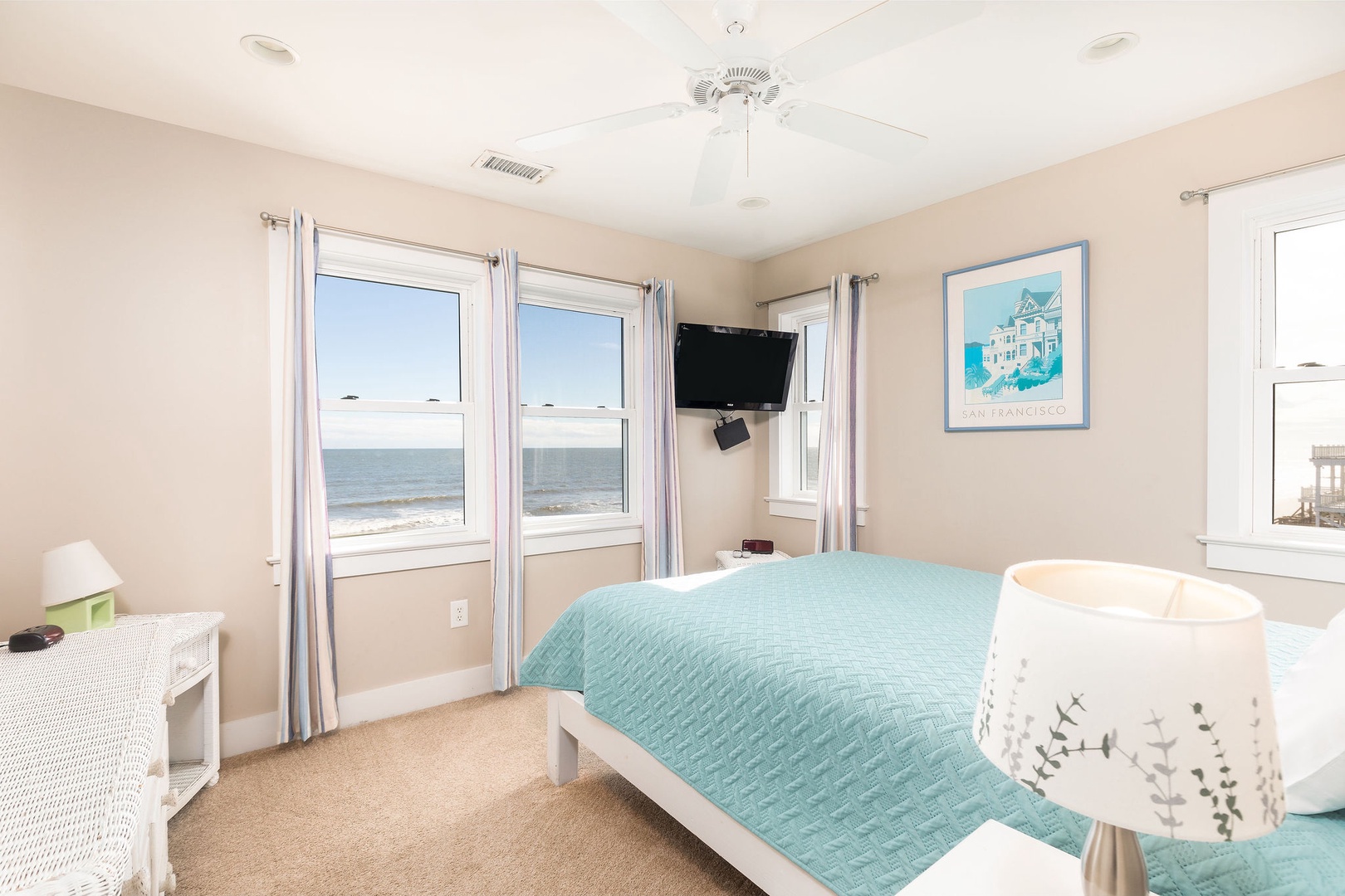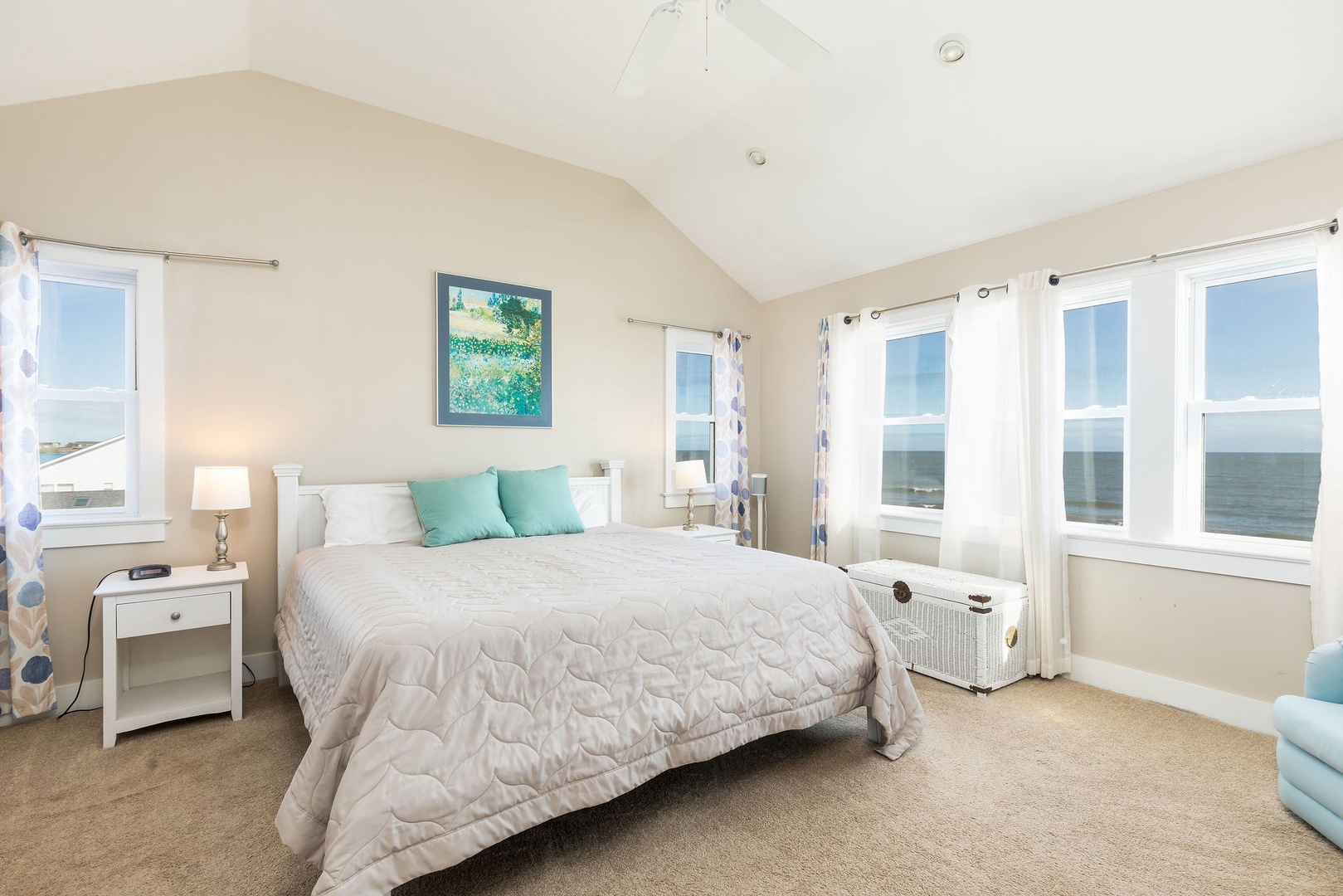 Primary Bedroom: Queen bed with cozy furnishings and ocean views.