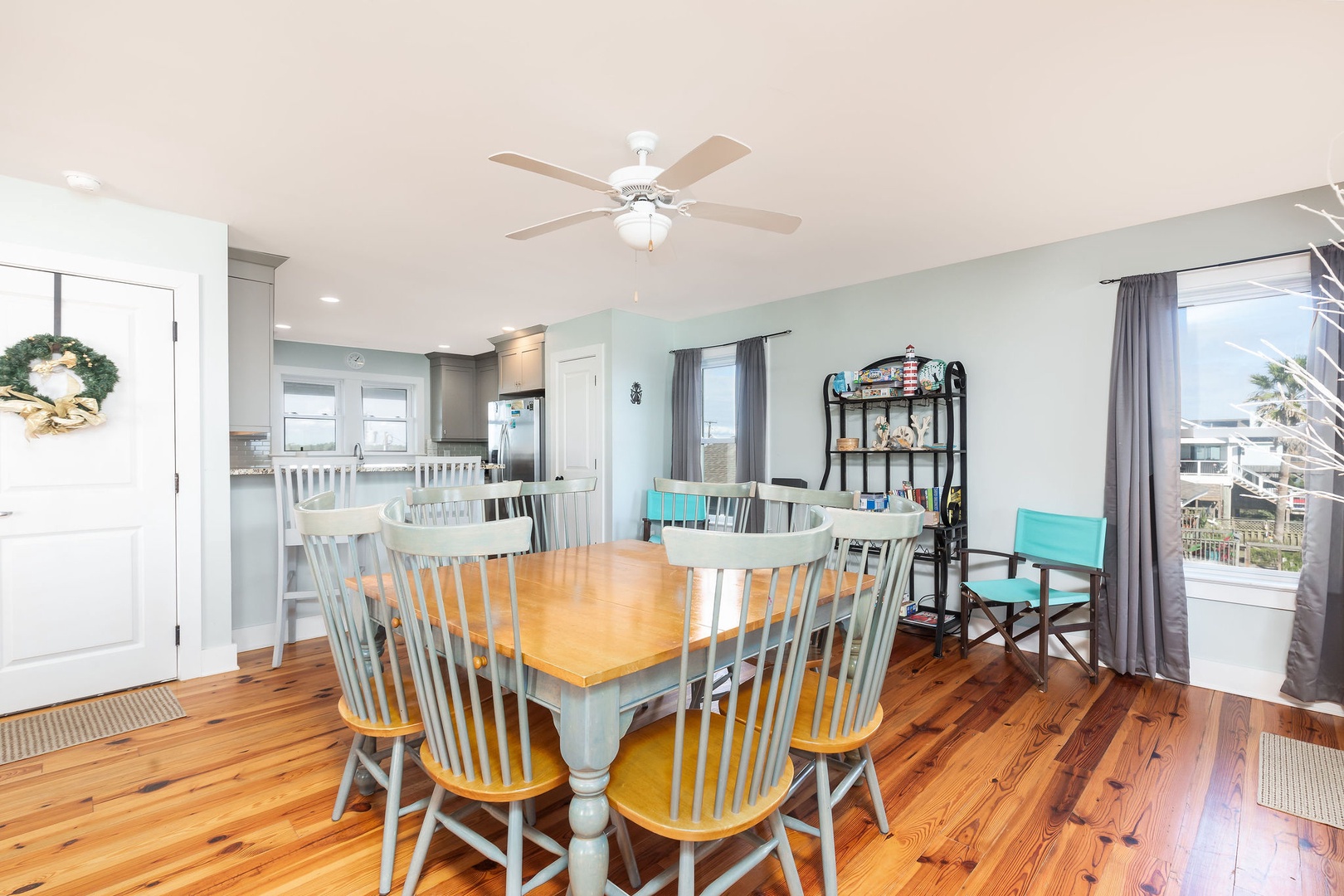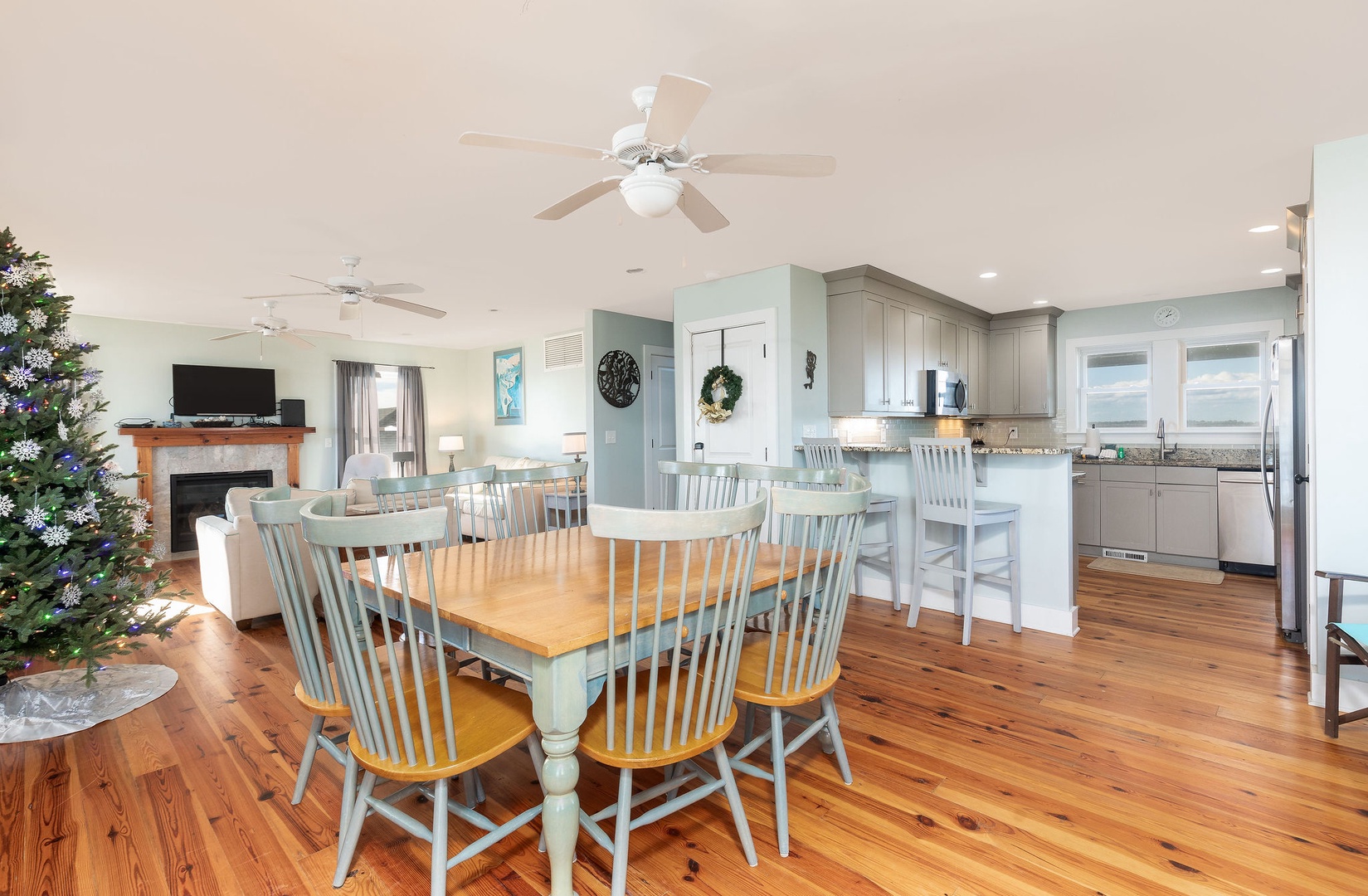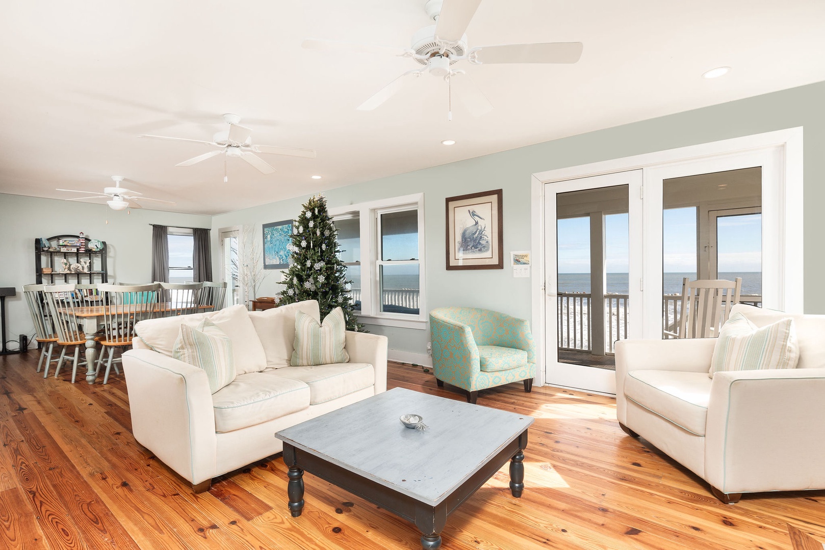 The open-plan living and dining area is designed for comfort and connection, featuring cozy seating and seamless access to the expansive oceanfront deck. Large windows allow natural light to fill the space, enhancing the coastal charm.